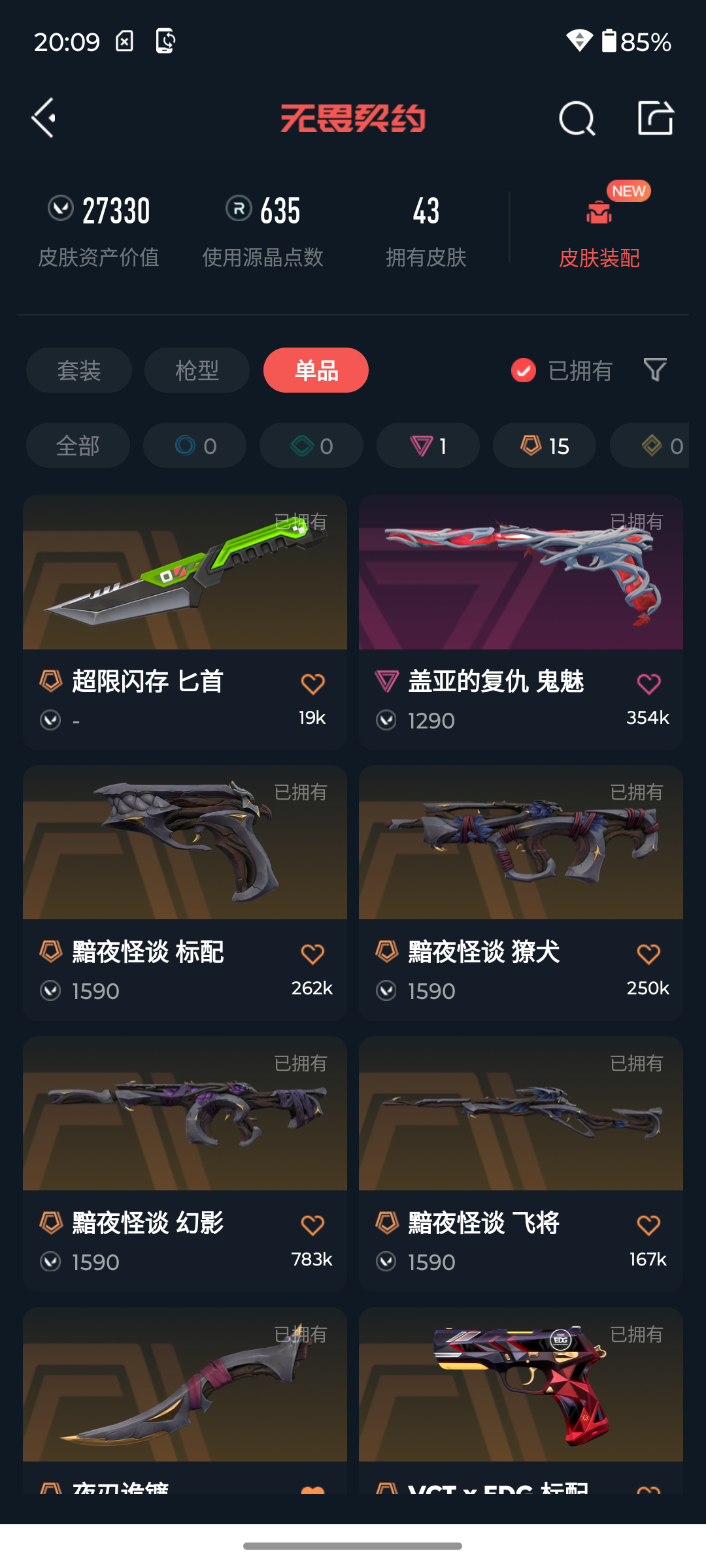 [14285885]b189967(黯夜怪谈套装/全息波普2.0套装)无畏契约/151等级/未定级/26英雄/43皮肤/27330资产/已使用r点635/剩余r点45/黯夜怪谈-幻影,黯夜怪谈-獠犬,黯夜怪谈-飞将,黯夜怪谈-标配,夜刃诡镰,全息波普//2.0-狂徒,全息波普//2.0-幻影,全息波普//2.0-冥驹,全息波普//2.0-标配,全息战斧,超限闪存-匕首,超能偶像-应援棒,rgx-11z-pro//3.0-爪刀,混沌序曲-狂徒,vct-x-edg-标配,盖亚的复仇-鬼魅