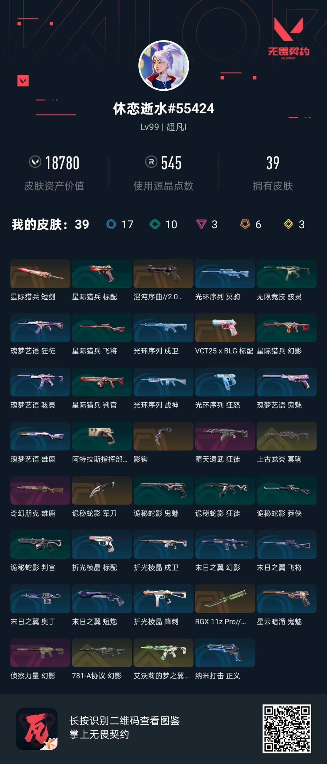 [14289816]6橙皮 3金皮 3紫皮 39皮肤 19英雄 75卡面 545已用源晶 超凡段位 【近战武器皮肤】:rgx 11z pro//2.0 蝴蝶刀诡秘蛇影星际猎兵 短剑影钩 【佩呛皮肤】:标配-vct25xblg正义-混沌序曲2.0 【冲锋呛皮肤】:骇灵-艾沃莉的梦之翼 【霰弹