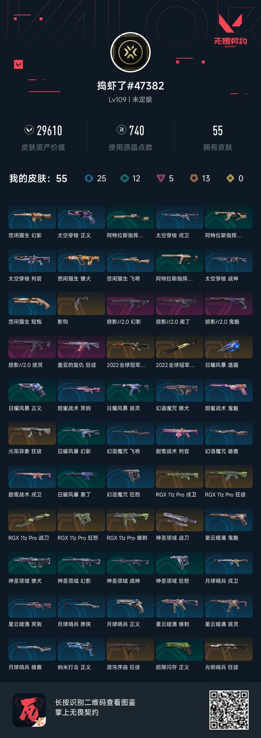[14292388]13橙皮 5紫皮 55皮肤 26英雄 71卡面 740已用源晶 未定级段位 【亮点皮肤】:幻影-2022全球冠军赛蝴蝶刀-2022全球冠军赛 【套装】:掠影2.0套装2022全球冠军赛rgx 11z pro套装 【近战武器皮肤】:rgx 11z pro 战刀神圣领域 战刀影钩 【佩呛皮肤】:狂怒-rgx 11z pro鬼魅-掠影2.0 【冲锋呛皮肤】:骇灵-掠影2.0蜂刺-rgx 11z pro 【步呛皮肤】:狂徒-混沌序曲狂徒-光明哨兵狂徒-光荣异象幻影-掠影2.0狂徒-rgx 11z pro戍卫-rgx 11z pro狂徒-盖亚的复仇 【机呛皮肤】:奥丁-掠影2.0 【挂饰】:袖珍捷风挂饰双城之战小蛋糕挂饰神中神挂饰2022全球冠军赛弯檐帽挂饰rgx11zpro挂饰糖葫芦挂饰终章ko小金人挂饰