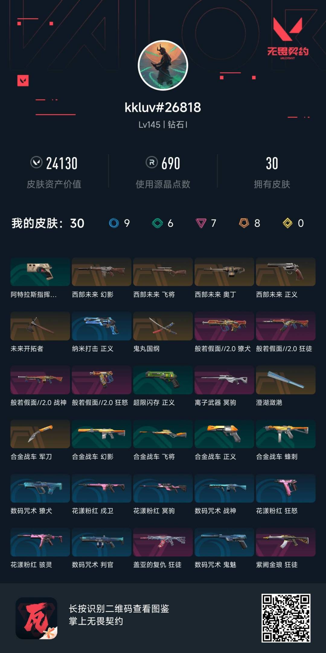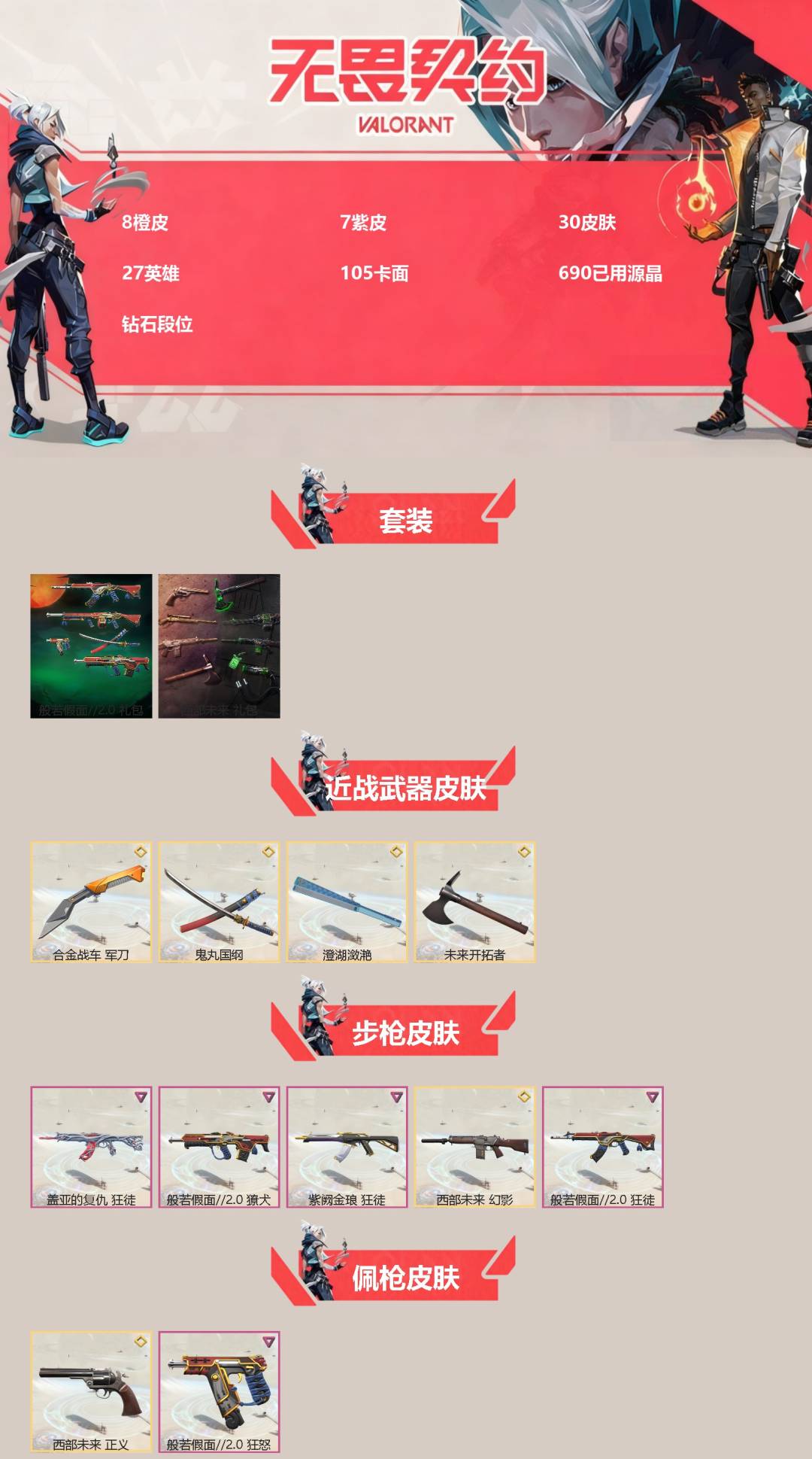 [14292717]8橙皮 7紫皮 30皮肤 27英雄 105卡面 690已用源晶 钻石段位 【套装】:般若假面//2.0套装西部未来 【近战武器皮肤】:未来开拓者鬼丸国纲澄湖潋滟军刀-合金战车 【佩呛皮肤】:狂怒-般若假面//2.0正义-西部未来 【步呛皮肤】:幻影-西部未来獠犬-般
