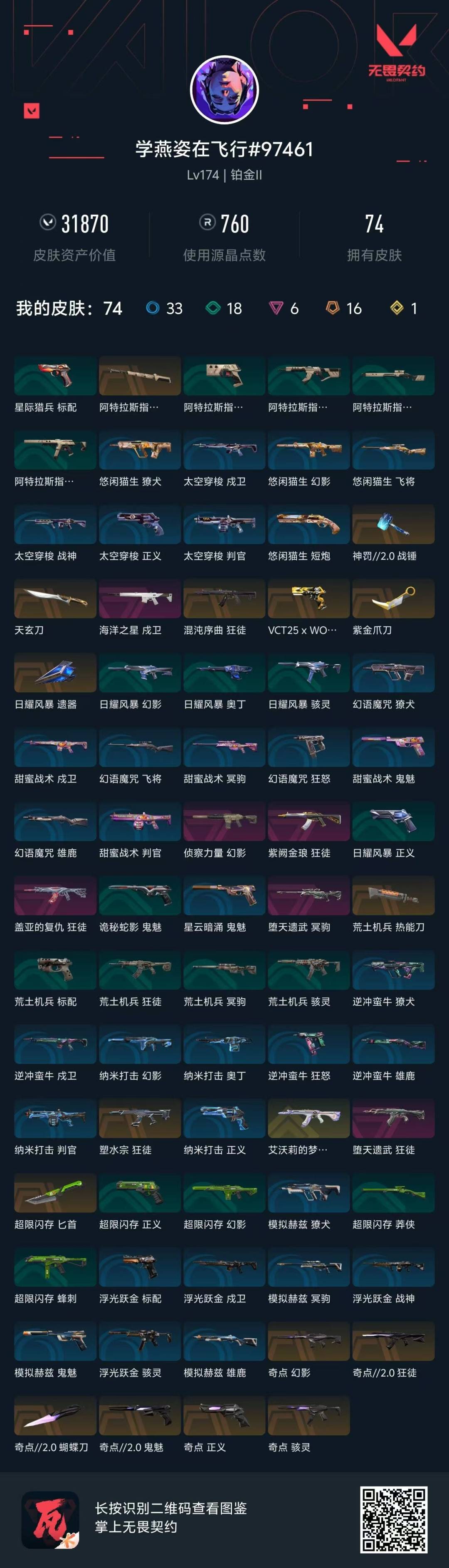 [14293054]段位: 铂金 套装: 奇点//2.0套装 近战武器皮肤: 天玄刀紫金爪刀匕首-超限闪存蝴蝶刀-奇点//2.0荒土机兵热能刀神罚2.0 战锤阿特拉斯指挥部 步呛皮肤: 幻影-奇点狂徒-紫阙金琅狂徒-盖亚的复仇幻影-侦察力量狂徒-塑水宗狂徒-堕天遗武戍卫-海洋