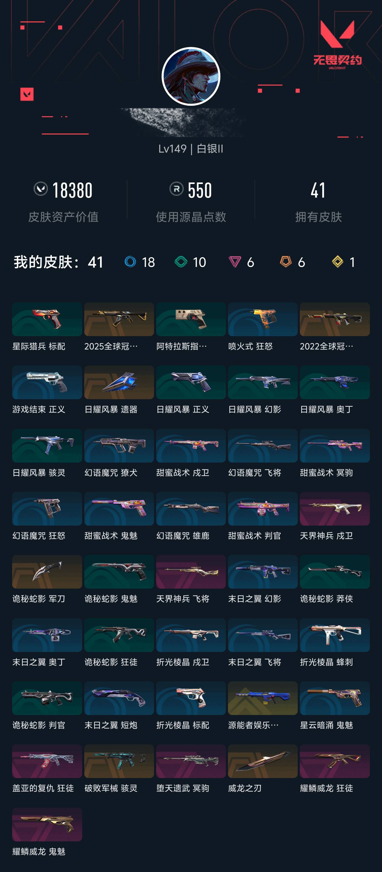 [27英雄 41皮肤 资产18380 22幻影 25狂徒 威龙之刃 盖亚狂徒 天界戍卫 耀鳞威龙礼包]【游戏等级】lv149 【段位】 白银ii 【r点】550 【皮肤总价值】18380 【英雄数量】27 【皮肤数量】41 【挂饰数量】68 【卡面数量】89 【喷漆数量】82 【标配】标配-星际猎兵 标配-阿特拉斯指挥部 标配-折光棱晶 【狂徒】狂徒-2025全球冠军赛 狂