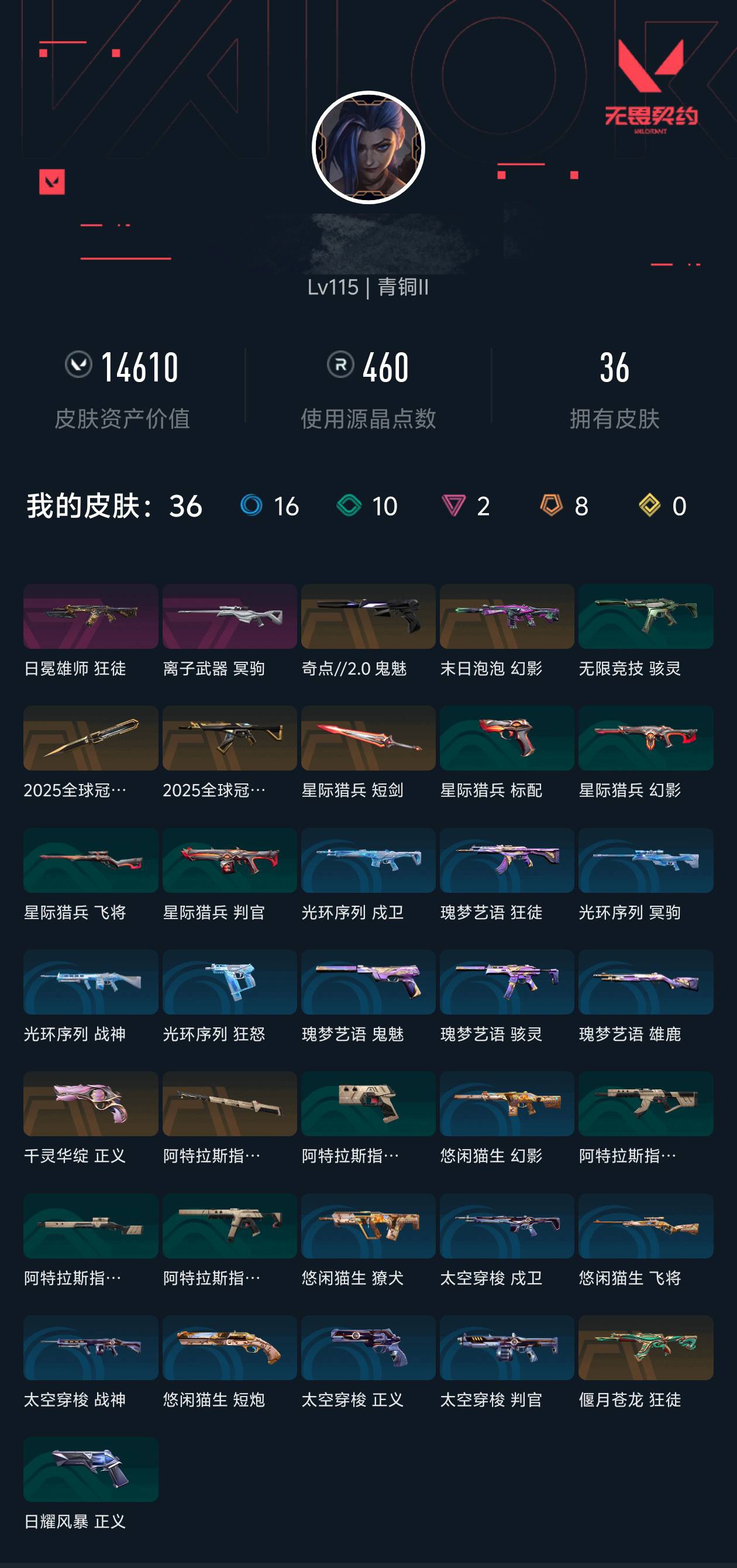 【25冠军套】【游戏等级】lv115 【段位】 青铜ii 【r点】460 【皮肤总价值】14610 【英雄数量】24 【皮肤数量】36 【挂饰数量】37 【卡面数量】54 【喷漆数量】48 【狂徒】狂徒-日冕雄师 狂徒-2025全球冠军赛 狂徒-瑰梦艺语 狂徒-阿特拉斯指挥部 狂徒-偃月苍龙 【冥驹】冥驹-离子武器 冥驹-光环序列 【鬼魅】鬼魅-奇点//2.0 鬼魅-瑰梦艺