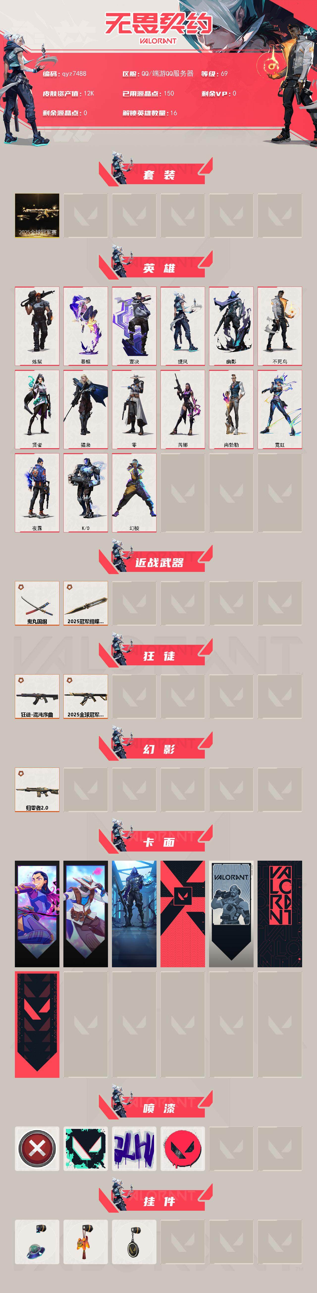 25冠军套/混沌ak/鬼丸-精品青铜小号急出可刀-qyz7488-近战武器皮肤:-鬼丸国纲2025全球冠军赛-蝴蝶刀-步呛皮肤:-狂徒-混沌序曲幻影-归零者//202025全球冠军赛-狂徒-亮点:-【qyz7488】【套装】:2025全球冠军赛套装【英雄】:幻棱,炼狱,暮蝶,壹决,捷风,幽影,不死鸟,贤者,猎枭,零,芮娜,尚勃勒,霓虹,夜露,k/o【近战-武器】:近战武器-2025全球冠军赛-蝴蝶刀,近战武器-鬼丸国纲【狂徒】:狂徒-2025全球冠军赛,狂徒-混沌序曲【幻影】:幻影-归零者//20【卡面】:无畏契约go!第一卷:芮娜-卡面,无畏契约go!第一卷:零-卡面,暗呛-卡面,代号红色-卡面,新兵报到-卡面,v契约-卡面,无畏契约-卡面【喷漆】:买装还是存钱-喷漆,胜利属于无畏契约-喷漆,glhf-喷漆,无畏契约-喷漆【挂饰】:天外飞客-挂饰,好运福爪-挂饰,无畏契约-纪念币-挂饰