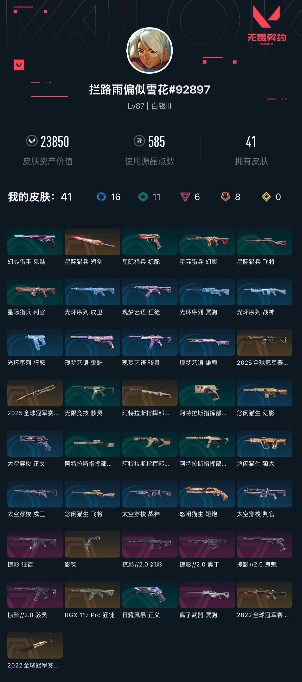 【无畏契约】【yhwww6738】等级:87,已用无畏点23850,已用源晶点585,紫皮:冥驹-离子武器|狂徒-掠影|骇灵-掠影2.0|奥丁-掠影2.0|鬼魅-掠影2.0|幻影-掠影2.0__段位:白银__绿皮:骇灵-无限竞技|正义-日耀风暴|短炮-悠闲猫生|飞将-悠闲猫生|幻影-悠闲猫生|獠犬-悠闲猫生|判官-星际猎兵|飞将-星际猎兵|标配-星际猎兵|鬼魅-幻心猎手__橙皮:狂徒-rgx 11z pro|近战-2022全球冠军赛 蝴蝶刀|幻影-2022全球冠军赛|近战-阿特拉斯指挥部 甩棍|近战-星际猎兵 短剑|狂徒-2025全球冠军赛|近战-2025全球冠军赛 蝴蝶刀|近战-影钩__蓝皮:正义-太空穿梭|战神-太空穿梭|判官-太空穿梭|戍卫-太空穿梭|骇灵-阿特拉斯指挥部|莽侠-阿特拉斯指挥部|标配-阿特拉斯指挥部|狂徒-阿特拉斯指挥部|狂怒-光环序列|戍卫-光环序列|冥驹-光环序列|战神-光环序列|狂徒-瑰梦艺语|鬼魅-瑰梦艺语|骇灵-瑰梦艺语|雄鹿-瑰梦艺语__英雄:尚勃勒|黑梦|斯凯|暮蝶|盖可|霓虹|壹决|k/o|幽影|夜露|钢锁|奇乐|炼狱|铁臂|贤者|猎枭|芮娜|零|捷风|蝰蛇|不死鸟|幻棱|雷兹|禁灭
