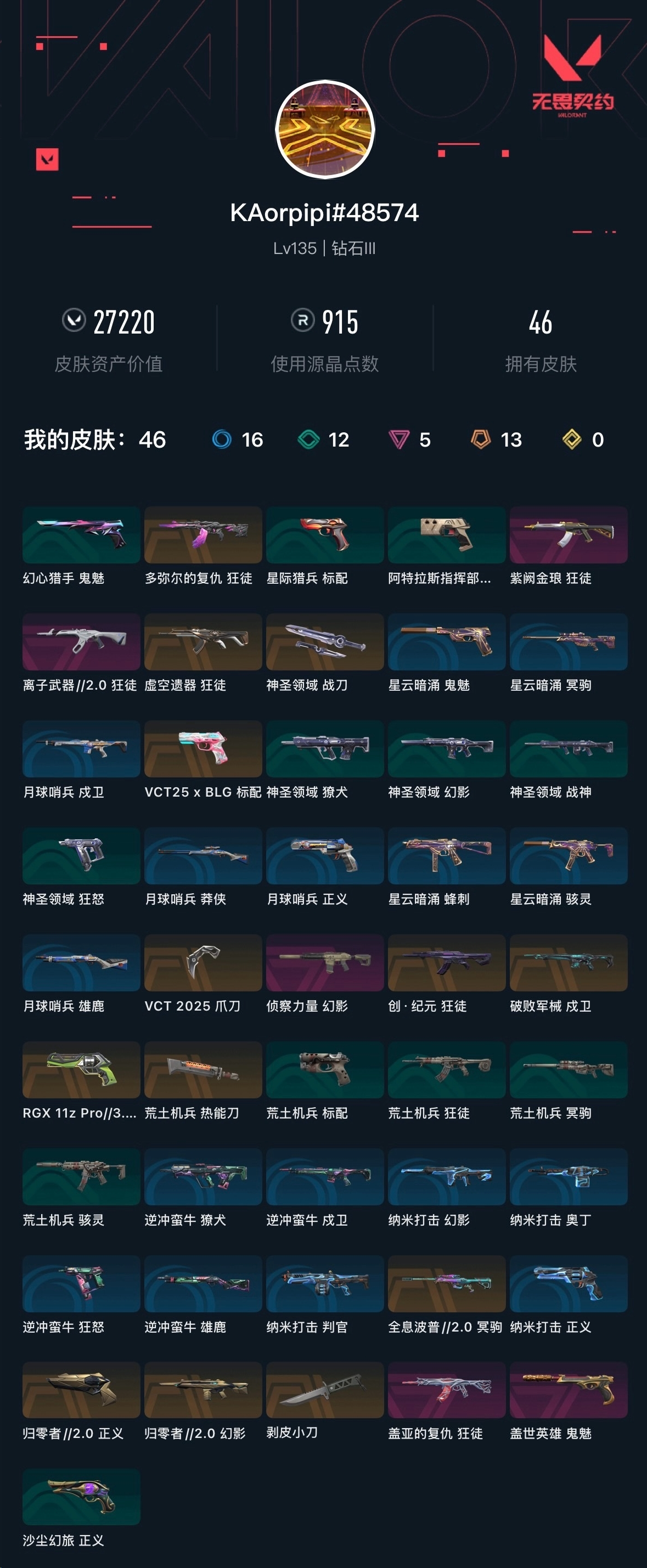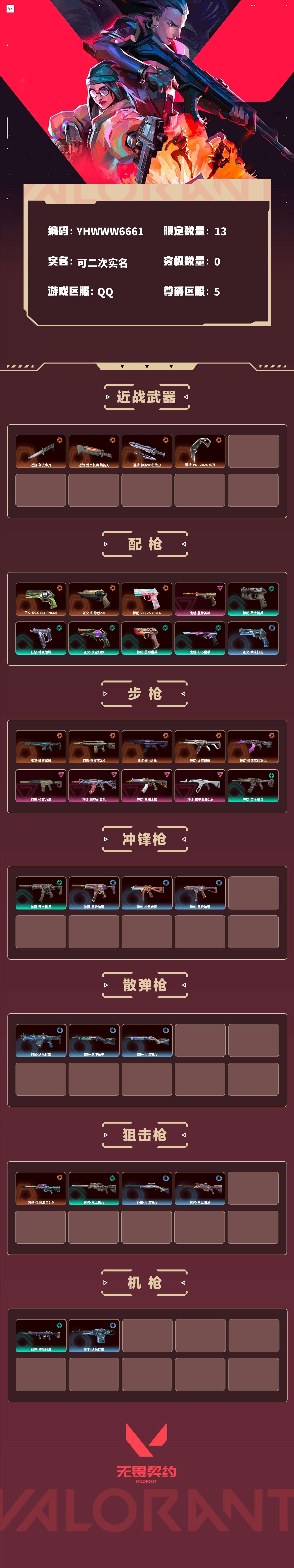 【无畏契约】【yhwww6661】等级:136,已用无畏点27810,已用源晶点915,橙皮:近战-剥皮小刀|戍卫-破败军械|正义-rgx 11z pro3.0|冥驹-全息波普2.0|近战-荒土机兵 热能刀|正义-归零者2.0|幻影-归零者2.0|狂徒-创·纪元|近战-神圣领域 战刀|标配-vct25 x blg|近战-vct 2025 爪刀|狂徒-虚空遗器|狂徒-多弥尔的复仇__紫皮:鬼魅-盖世英雄|幻影-侦察力量|狂徒-盖亚的复仇|狂徒-紫阙金琅|狂徒-离子武器2.0__段位:钻石__蓝皮:判官-纳米打击|正义-纳米打击|奥丁-纳米打击|幻影-纳米打击|雄鹿-逆冲蛮牛|狂怒-逆冲蛮牛|戍卫-逆冲蛮牛|獠犬-逆冲蛮牛|鬼魅-星云暗涌|骇灵-星云暗涌|正义-月球哨兵|莽侠-月球哨兵|戍卫-月球哨兵|雄鹿-月球哨兵|蜂刺-橙色疾影|冥驹-星云暗涌|蜂刺-星云暗涌|标配-阿特拉斯指挥部__绿皮:狂徒-荒土机兵|标配-荒土机兵|骇灵-荒土机兵|冥驹-荒土机兵|獠犬-神圣领域|狂怒-神圣领域|战神-神圣领域|幻影-神圣领域|正义-沙尘幻旅|标配-星际猎兵|鬼魅-幻心猎手__英雄:尚勃勒|维斯|黑梦|斯凯|暮蝶|盖可|霓虹|壹决|k/o|幽影|夜露|钢锁|奇乐|炼狱|铁臂|贤者|猎枭|钛狐|芮娜|零|捷风|蝰蛇|不死鸟|幻棱|雷兹|禁灭