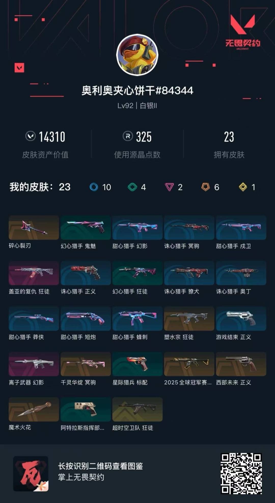 6橙皮 1金皮 2紫皮 23皮肤 17英雄 43卡面 325已用源晶 白银段位 【近战武器皮肤】:碎心裂刃魔术火花 【佩呛皮肤】:正义-西部未来 【步呛皮肤】:2025全球冠军赛 狂徒狂徒-超时空卫队狂徒-盖亚的复仇狂徒-塑水宗幻影-离子武器 【狙击呛皮肤】:冥驹-千灵华绽 【挂饰】:飞