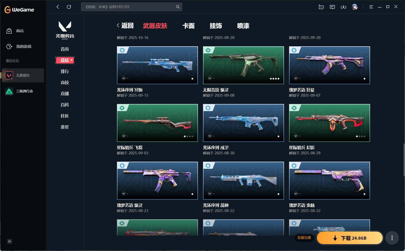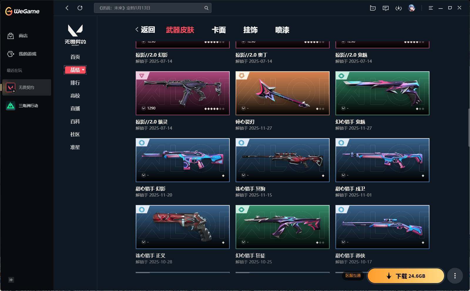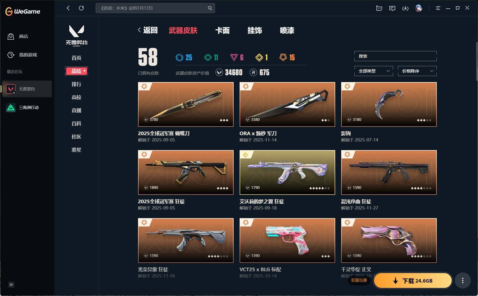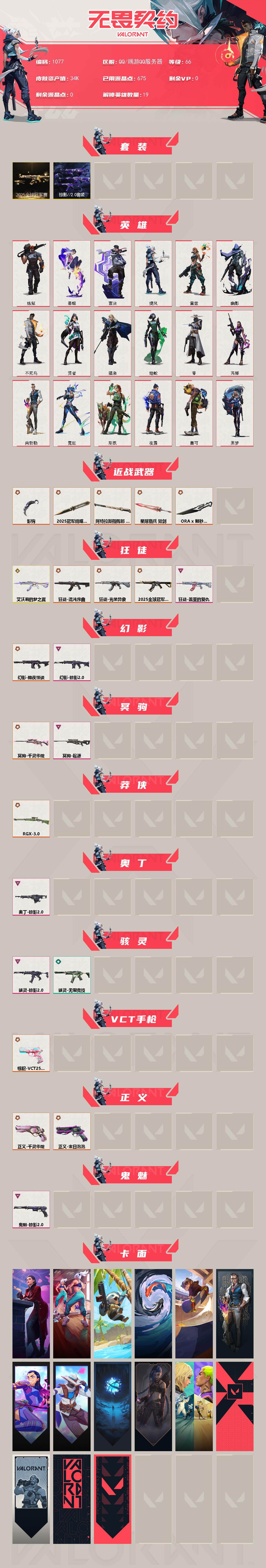 【1077】xq31738 【套装】:2025全球冠军赛套装,掠影//2.0套装 【英雄】:炼狱,暮蝶,壹决,捷风,雷兹,幽影,不死鸟,贤者,猎枭,蝰蛇,零,芮娜,尚勃勒,霓虹,斯凯,夜露,盖可,黑梦 【近战 武器】:近战武器-2025全球冠军赛 蝴蝶刀,近战武器-a x 颗秒 军刀,近战武器-影钩,近战武器-阿特拉斯指挥部 甩棍,近战武器-星际猎兵 短剑 【狂徒】:狂徒-艾沃莉的梦之翼,狂徒-2025全球冠军赛,狂徒-混沌序曲,狂徒-光荣异象,狂徒-盖亚的复仇 【幻影】:幻影-黯夜怪谈,幻影-掠影//2.0 【冥驹】:冥驹-千灵华绽,冥驹-起源 【莽侠】:莽侠-rgx 11z pro//3.0 【奥丁】:奥丁-掠影//2.0 【骇灵】:骇灵-掠影//2.0,骇灵-无限竞技 【vct手呛】:标配-vct25 x blg 【正义】:正义-千灵华绽,正义-末日泡泡 【鬼魅】:鬼魅-掠影//2.0 【卡面】:从黄昏到黎明 卡面,热舞环节 卡面,树懒大作战 卡面,红鳞松叶 卡面,clutch 卡面,无畏契约:尚勃勒 卡面,无畏契约go!第一卷:芮娜 卡面,无畏契约go!第一卷:零 卡面,无垠星环 卡面,《双城之战》金克丝 卡面,钢锁vs盖可 卡面,代号红色 卡面,新兵报到 卡面,v契约 卡面,无畏契约 卡面 【喷漆】:分身有术 喷漆,致命优雅 喷漆,买装还是存钱 喷漆,酷熊冲浪 喷漆,红鳞 喷漆,无畏契约go!第一卷:零 喷漆,无畏契约go!第一卷:贤者 喷漆,胜利属于无畏契约 喷漆,glhf 喷漆,无畏契约 喷漆 【挂饰】:无畏契约go!第一卷 零 挂饰,鱼骨头 挂饰,有事联系 挂饰,天外飞客 挂饰,红鳞松叶 挂饰,无畏契约 纪念币 挂饰