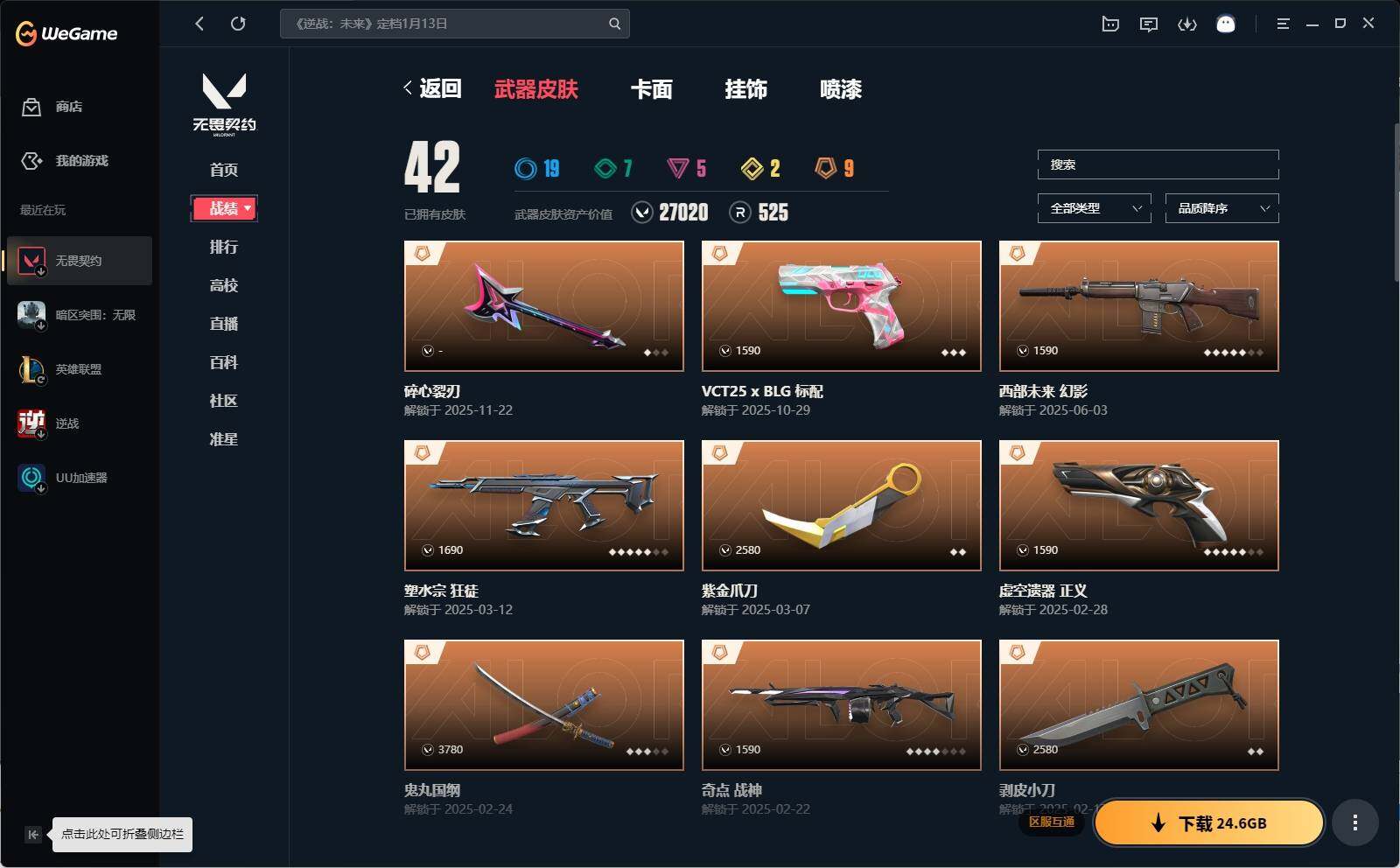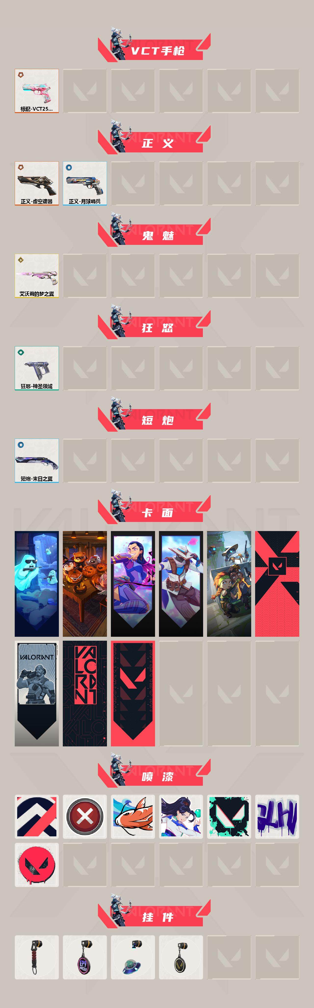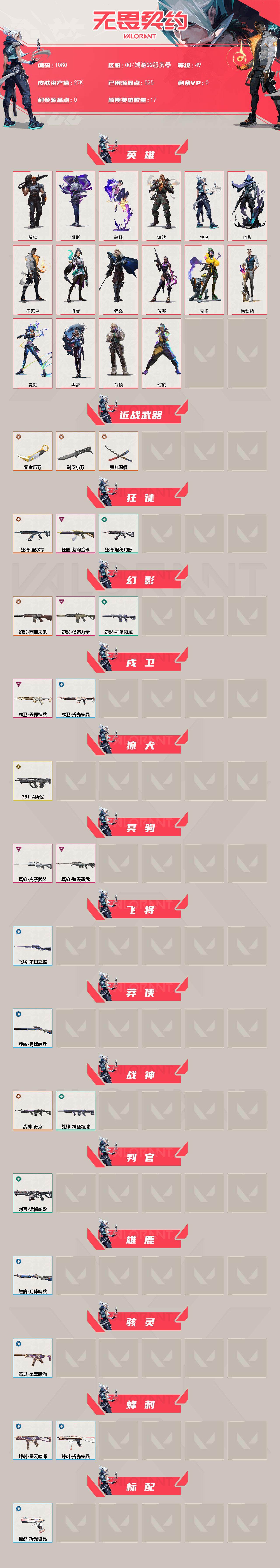 【1080】xq34191 【英雄】:幻棱,炼狱,维斯,暮蝶,铁臂,捷风,幽影,不死鸟,贤者,猎枭,芮娜,奇乐,尚勃勒,霓虹,黑梦,钢锁 【近战 武器】:近战武器-剥皮小刀,近战武器-紫金爪刀,近战武器-鬼丸国纲 【狂徒】:狂徒-塑水宗,狂徒-紫阙金琅,狂徒-诡秘蛇影 【幻影】:幻影-西部未来,幻影-侦察力量,幻影-神圣领域,幻影-西部未来 【戍卫】:戍卫-天界神兵,戍卫-折光棱晶 【獠犬】:獠犬-781-a协议 【冥驹】:冥驹-堕天遗武,冥驹-离子武器 【飞将】:飞将-末日之翼 【莽侠】:莽侠-月球哨兵 【战神】:战神-奇点,战神-神圣领域 【判官】:判官-诡秘蛇影 【雄鹿】:雄鹿-月球哨兵 【骇灵】:骇灵-星云暗涌 【蜂刺】:蜂刺-星云暗涌,蜂刺-折光棱晶 【标配】:标配-折光棱晶 【vct手呛】:标配-vct25 x blg 【正义】:正义-虚空遗器,正义-月球哨兵 【鬼魅】:鬼魅-艾沃莉的梦之翼 【狂怒】:狂怒-神圣领域 【短炮】:短炮-末日之翼 【卡面】:精灵大战 卡面,南瓜盛典 卡面,无畏契约go!第一卷:芮娜 卡面,无畏契约go!第一卷:零 卡面,别冒尖 卡面,代号红色 卡面,新兵报到 卡面,v契约 卡面,无畏契约 卡面 【喷漆】:控场勿近 喷漆,买装还是存钱 喷漆,红鳞 喷漆,无畏契约go!第一卷:贤者 喷漆,胜利属于无畏契约 喷漆,glhf 喷漆,无畏契约 喷漆 【挂饰】:伞绳 挂饰,第九季//第三幕 纪念币 挂饰,天外飞客 挂饰,无畏契约 纪念币 挂饰