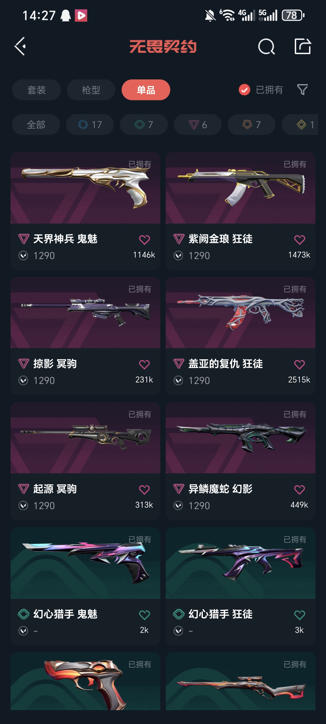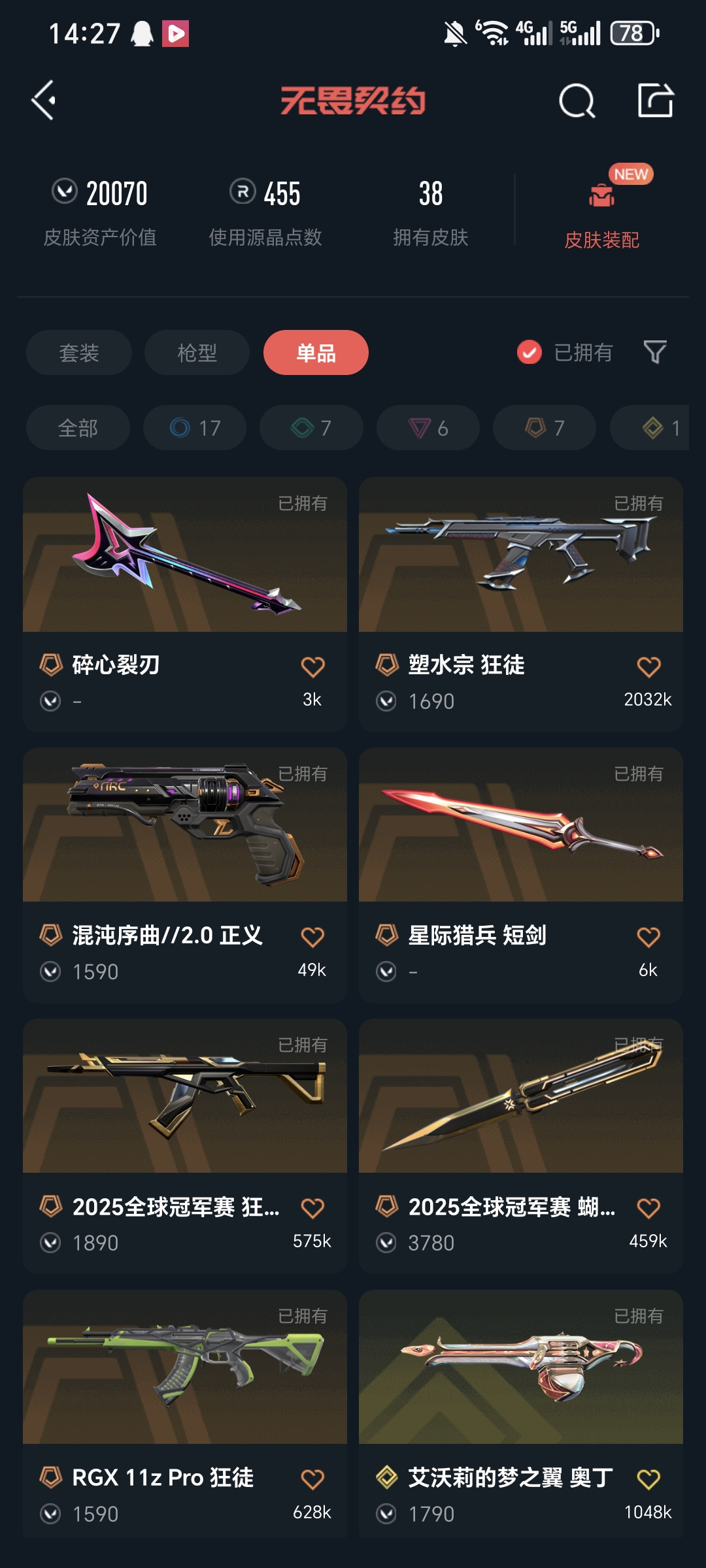 【25年冠军套】【游戏等级】lv82 【段位】 白银iii 【r点】455 【皮肤总价值】20070 【英雄数量】20 【皮肤数量】38 【挂饰数量】31 【卡面数量】46 【喷漆数量】42 【鬼魅】鬼魅-天界神兵 鬼魅-幻心猎手 鬼魅-瑰梦艺语 【狂徒】狂徒-紫阙金琅 狂徒-盖亚的复仇 狂徒-幻心猎手 狂徒-塑水宗 狂徒-瑰梦艺语 狂徒-2025全球冠军赛 狂徒-rgx1