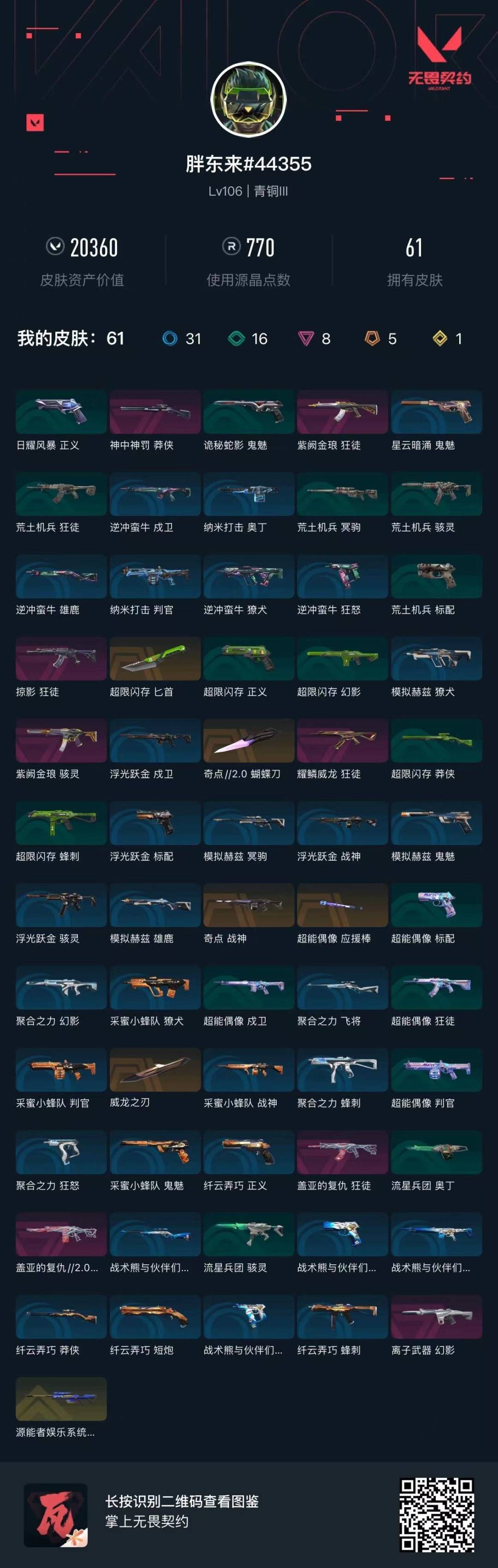 [14316849]5橙皮 1金皮 8紫皮 61皮肤 28英雄 88卡面 770已用源晶 青铜段位 【近战武器皮肤】:匕首-超限闪存蝴蝶刀-奇点//2.0威龙之刃超能偶像 应援棒 【冲锋呛皮肤】:骇灵-紫阙金琅 【步呛皮肤】:狂徒-掠影狂徒-紫阙金琅狂徒-盖亚的复仇狂徒-耀鳞威龙幻影