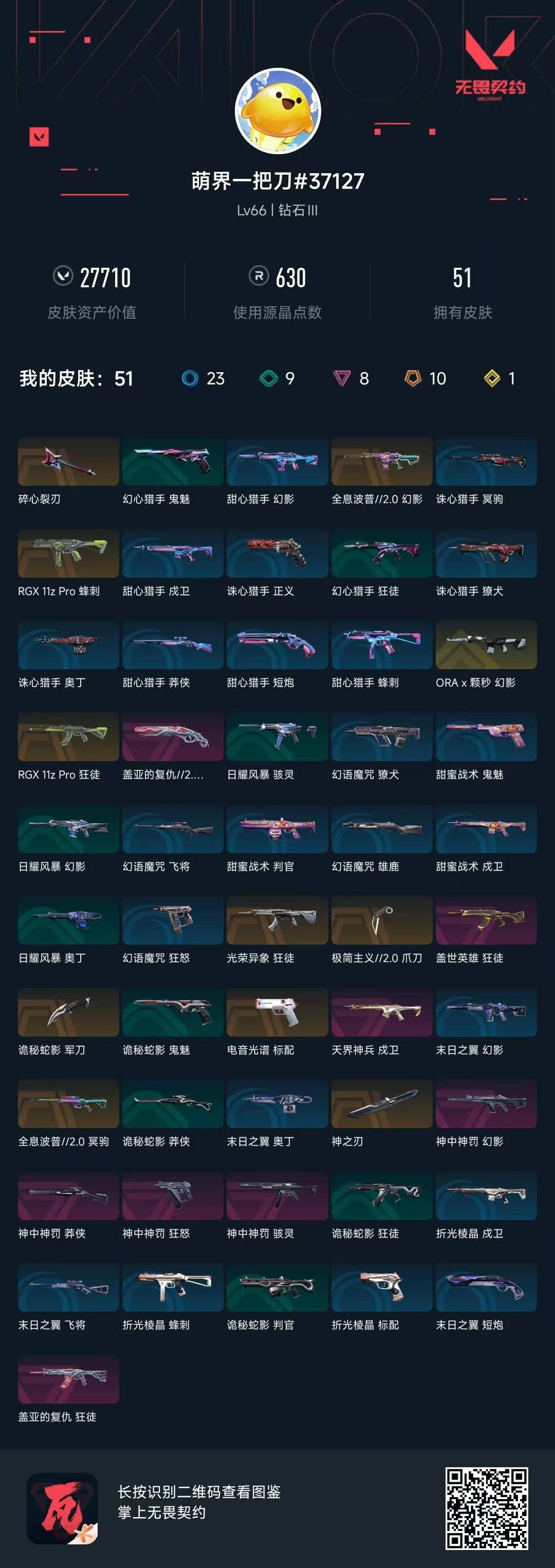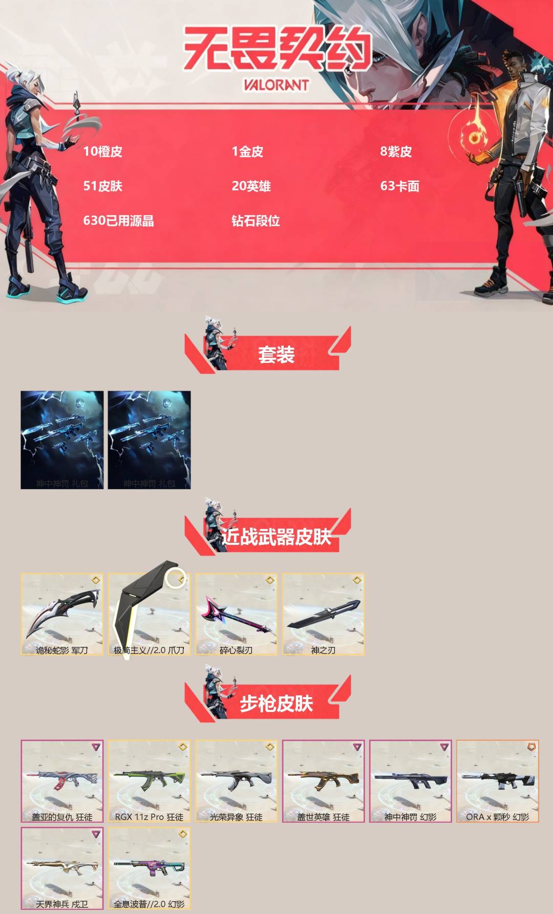 [14318181]10橙皮 1金皮 8紫皮 51皮肤 20英雄 63卡面 630已用源晶 钻石段位 【套装】:神罚套装神中神罚套装 【近战武器皮肤】:神之刃极简主义2.0 爪刀诡秘蛇影碎心裂刃 【佩呛皮肤】:狂怒-神中神罚标配-电音光谱短炮-盖亚的复仇2.0 【冲锋呛皮肤】:蜂刺-r