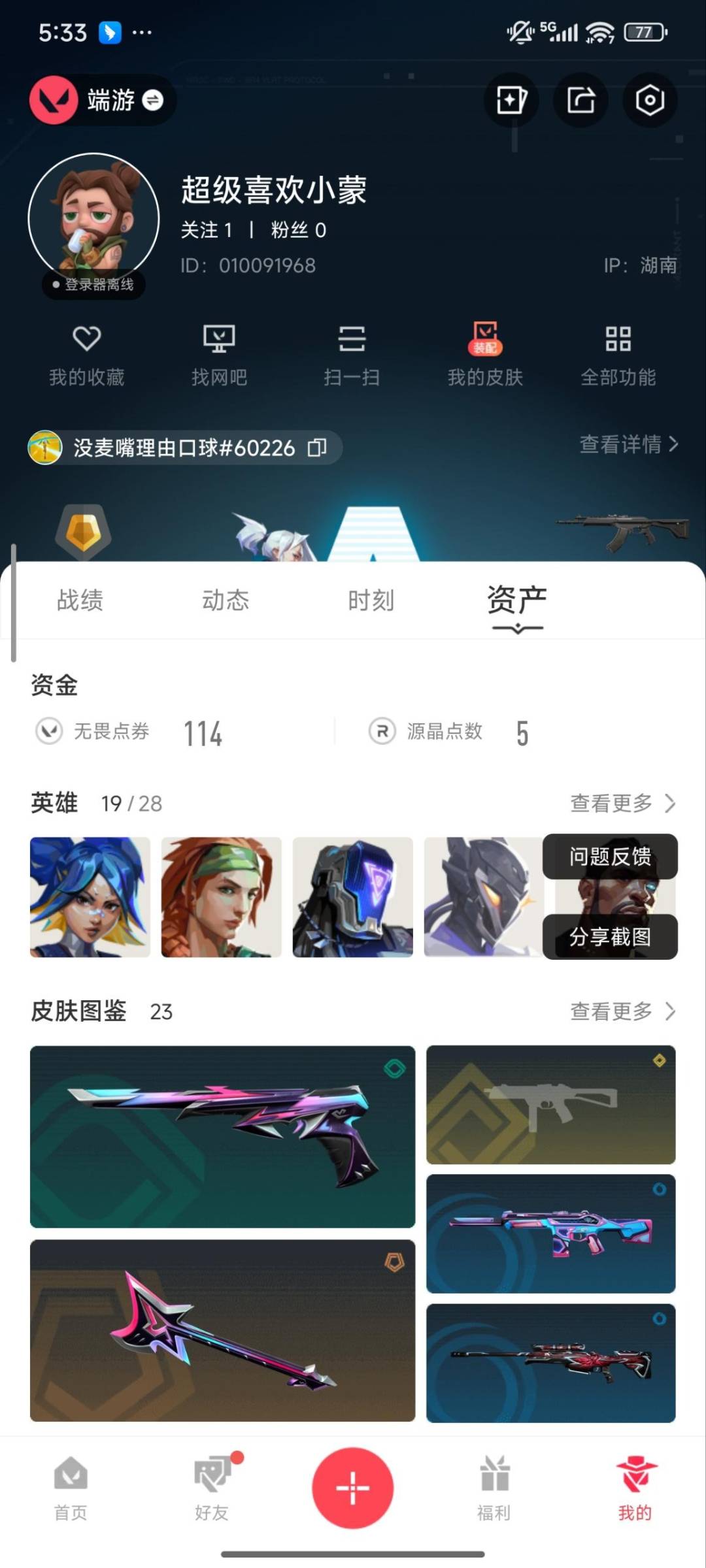 [14318703]5橙皮 5金皮 23皮肤 19英雄 50卡面 435已用源晶 黄金段位 【套装】:ax颗秒 【近战武器皮肤】:ax颗秒 军刀碎心裂刃魔术火花 【佩呛皮肤】:正义-ax颗秒鬼魅-超时空卫队 【步呛皮肤】:狂徒-ax颗秒幻影-ax颗秒獠犬-归零者 【狙