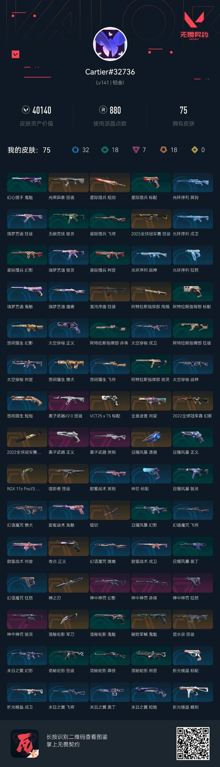 [14318720]18橙皮 7紫皮 75皮肤 28英雄 104卡面 880已用源晶 铂金段位 【亮点皮肤】:幻影-2022全球冠军赛蝴蝶刀-2022全球冠军赛 【套装】:神罚套装2022全球冠军赛神中神罚套装 【近战武器皮肤】:神之刃阿特拉斯指挥部镭切诡秘蛇影星际猎兵 短剑爪刀-