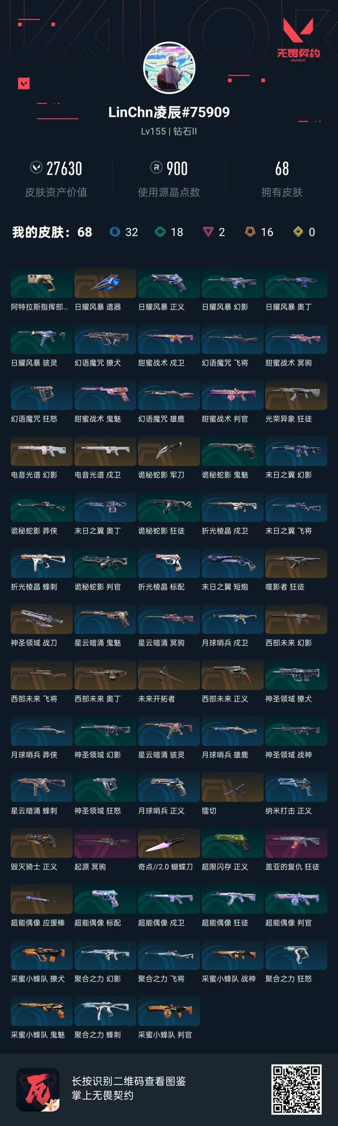 16橙皮 2紫皮 68皮肤 27英雄 121卡面 900已用源晶 钻石段位 【套装】:西部未来 【近战武器皮肤】:神圣领域 战刀未来开拓者诡秘蛇影镭切蝴蝶刀-奇点//2.0超能偶像 应援棒 【佩呛皮肤】:正义-毁灭骑士正义-西部未来 【步呛皮肤】:戍卫-电音光谱狂徒-光荣异象幻影-