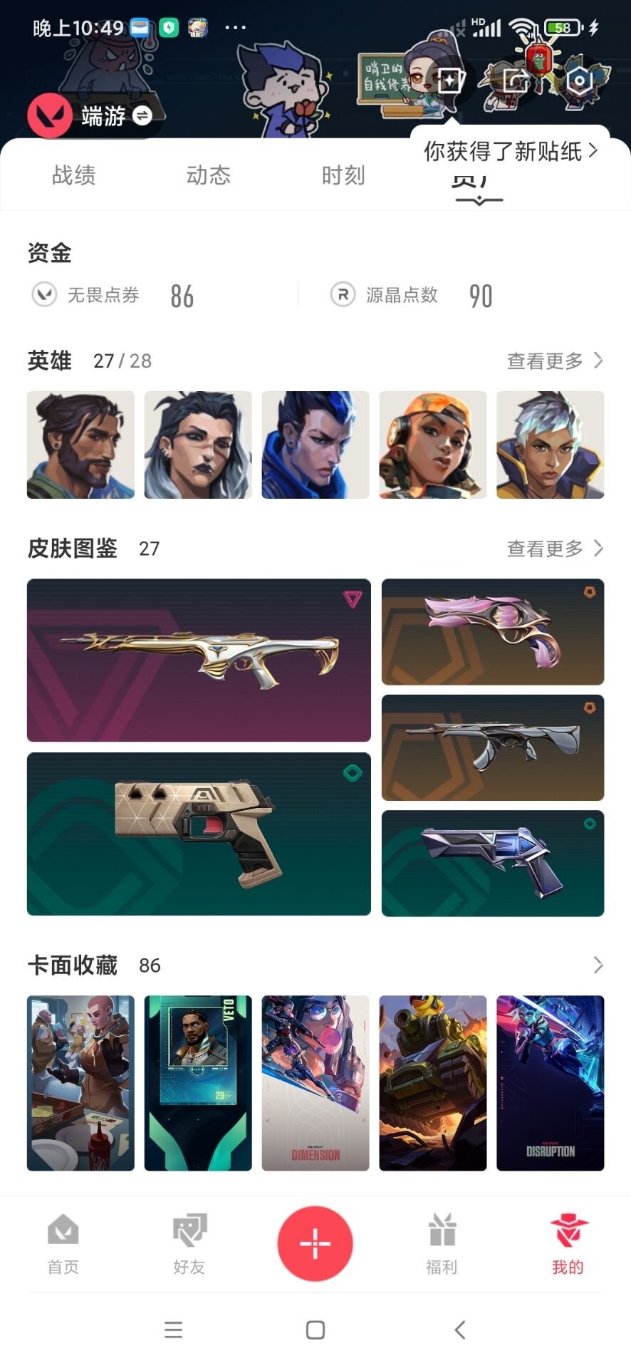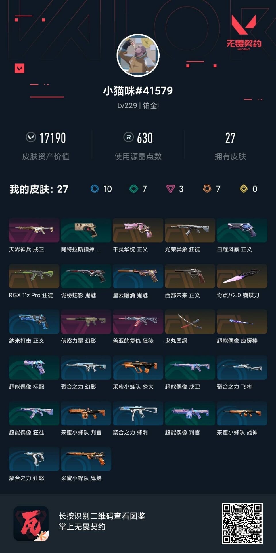 7橙皮 3紫皮 27皮肤 27英雄 86卡面 630已用源晶 铂金段位 【近战武器皮肤】:蝴蝶刀-奇点//2.0鬼丸国纲超能偶像 应援棒 【佩呛皮肤】:正义-西部未来正义-千灵华绽 【步呛皮肤】:狂徒-光荣异象狂徒-rgx 11z pro狂徒-盖亚的复仇幻影-侦察力量戍卫-天界神兵