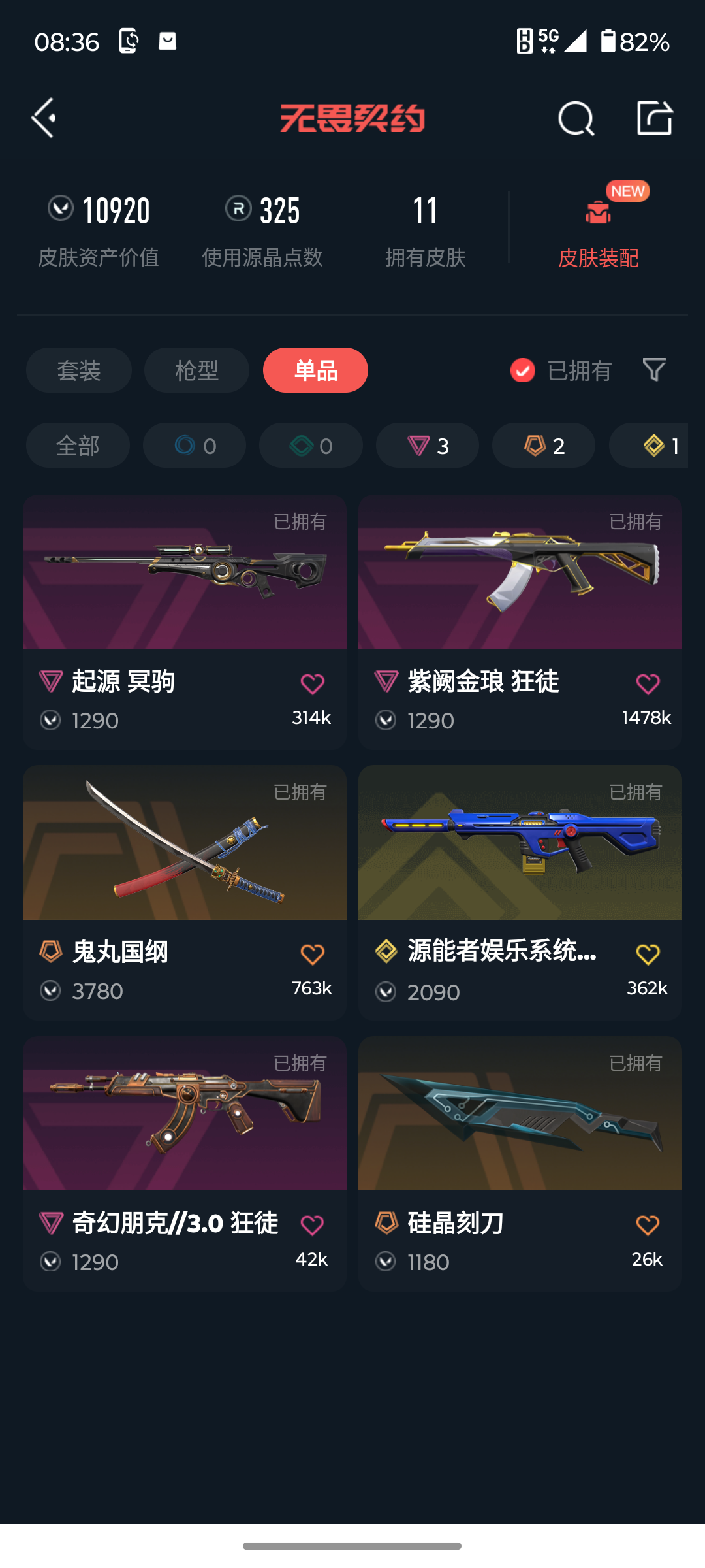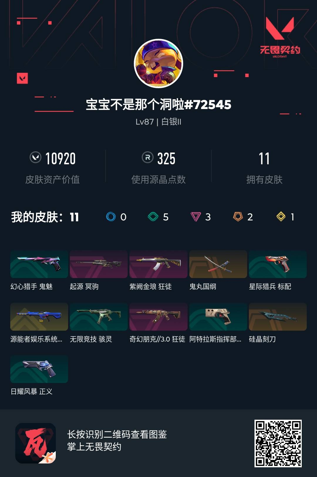[14321278]q192242 无畏契约/等级87/段位白银2/英雄16/皮肤11/资产10920/已使用r点325/剩余r点60/硅晶刻刀,鬼丸国纲,源能者娱乐系统-幻影,紫阙金琅-狂徒,奇幻朋克//3.0-狂徒,起源-冥驹