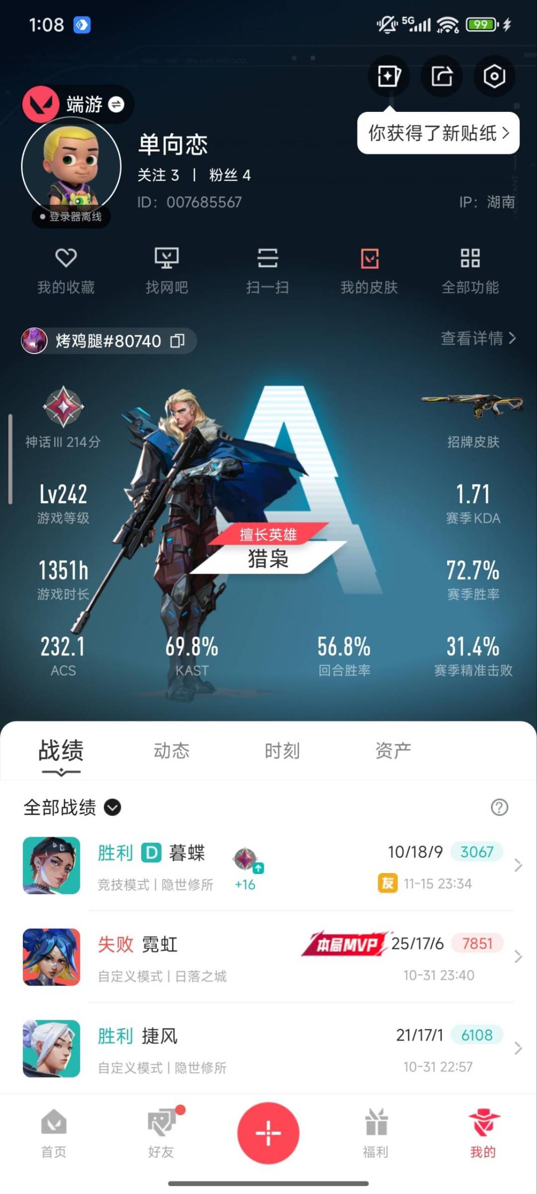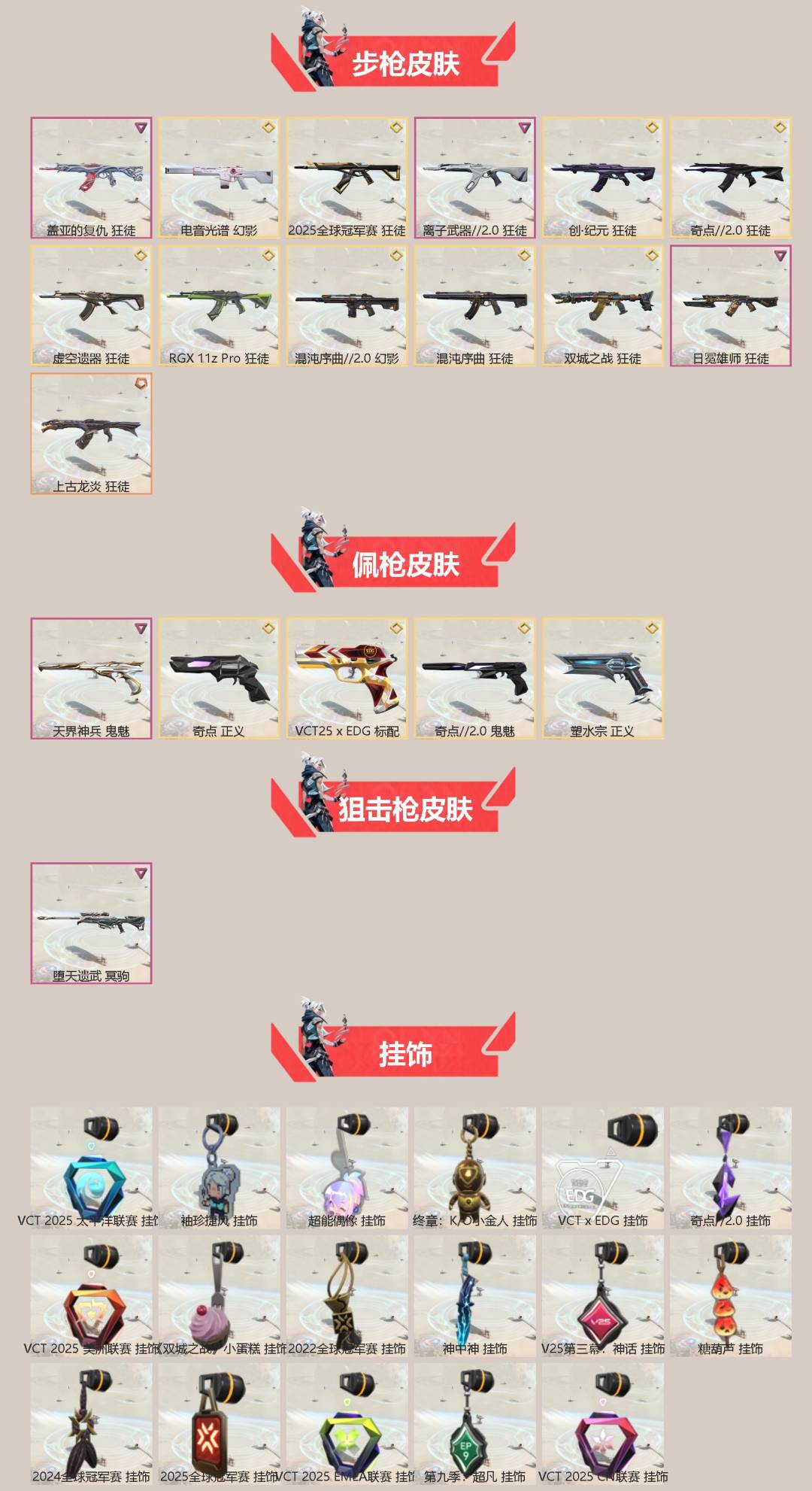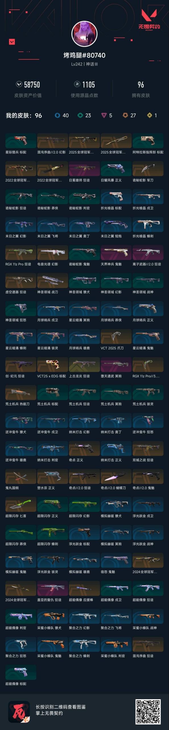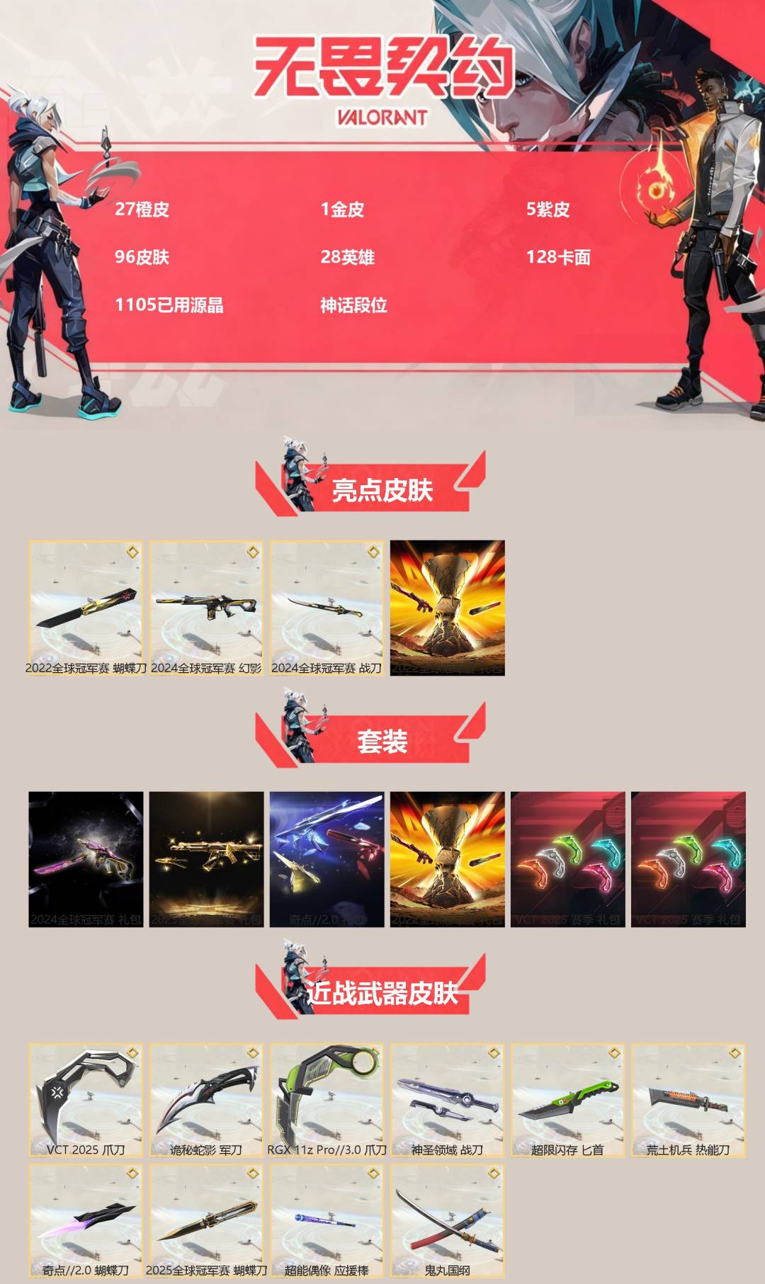 27橙皮 1金皮 5紫皮 96皮肤 28英雄 128卡面 1105已用源晶 神话段位 【亮点皮肤】:幻影-2024全球冠军赛战刀-2024全球冠军赛幻影-2022全球冠军赛蝴蝶刀-2022全球冠军赛 【套装】:奇点//2.0套装2025全球冠军赛2022全球冠军赛vct 2025赛季礼