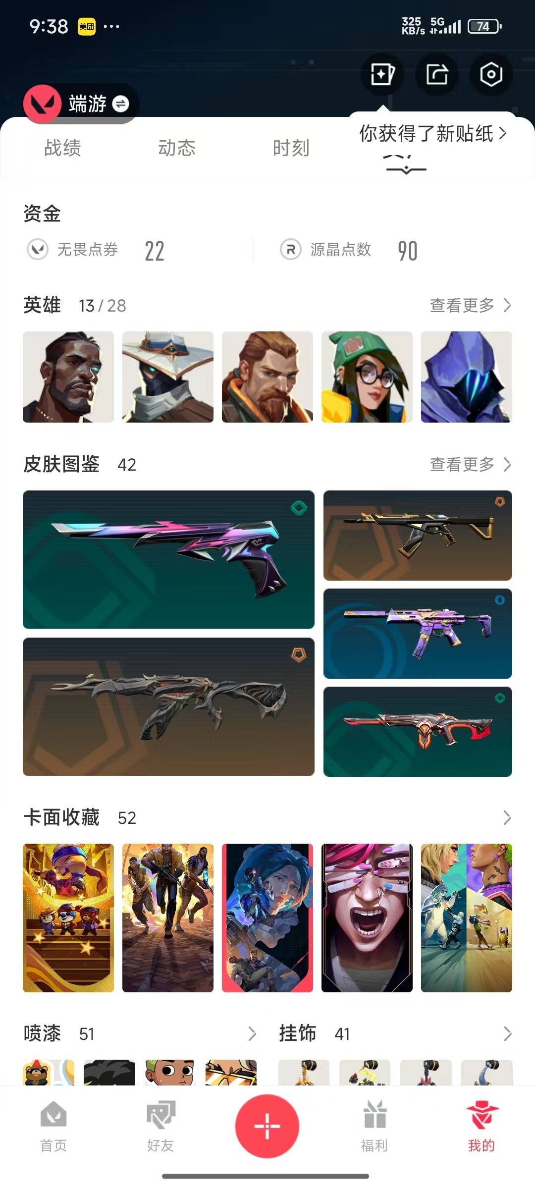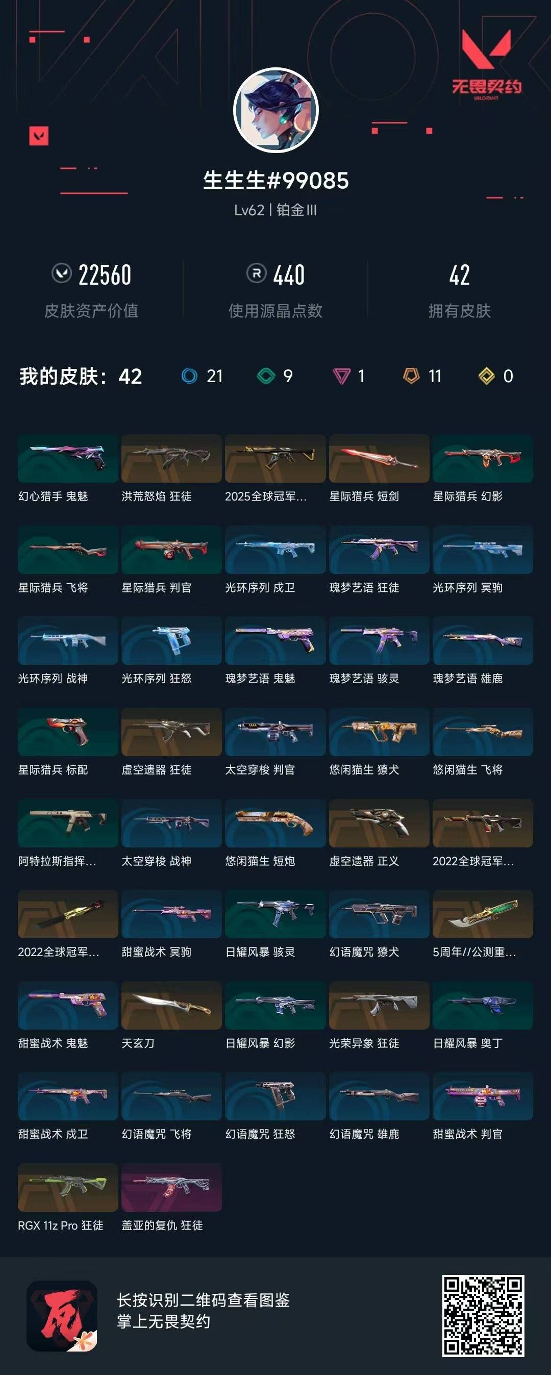 11橙皮 1紫皮 42皮肤 13英雄 52卡面 440已用源晶 铂金段位 【亮点皮肤】:幻影-2022全球冠军赛蝴蝶刀-2022全球冠军赛 【套装】:2022全球冠军赛 【近战武器皮肤】:苍龙之刃星际猎兵 短剑天玄刀 【佩呛皮肤】:正义-虚空遗器 【步呛皮肤】:狂徒-虚空遗器狂徒-光荣异象