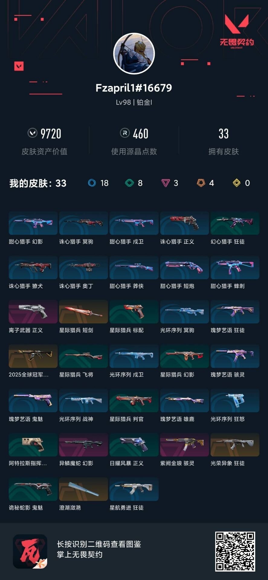 [14334615]4橙皮 3紫皮 33皮肤 20英雄 55卡面 460已用源晶 铂金段位 【近战武器皮肤】:星际猎兵 短剑澄湖潋滟 【佩呛皮肤】:正义-离子武器 【冲锋呛皮肤】:骇灵-紫阙金琅 【步呛皮肤】:幻影-异鳞魔蛇狂徒-光荣异象2025全球冠军赛 狂徒 【挂饰】:神中神挂饰