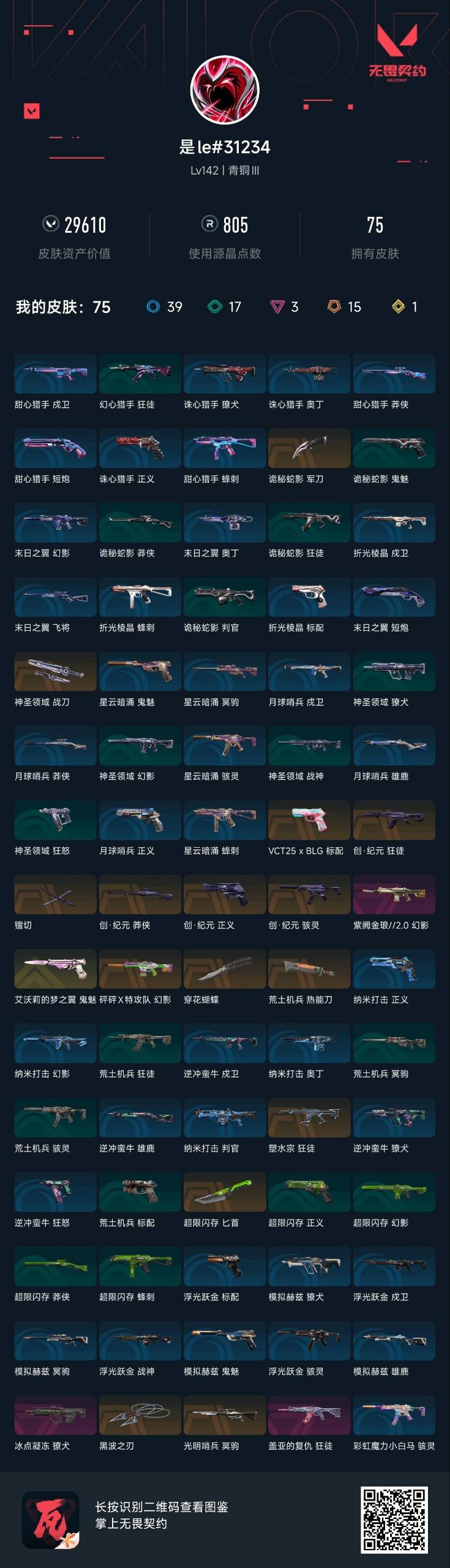 15橙皮 1金皮 3紫皮 75皮肤 25英雄 98卡面 805已用源晶 青铜段位 【套装】:创·纪元套装 【近战武器皮肤】:匕首-超限闪存神圣领域 战刀镭切穿花蝴蝶荒土机兵热能刀诡秘蛇影黑波之刃 【佩呛皮肤】:标配-vct25xblg正义-创·纪元鬼魅-艾沃莉的梦之翼 【冲锋呛皮肤