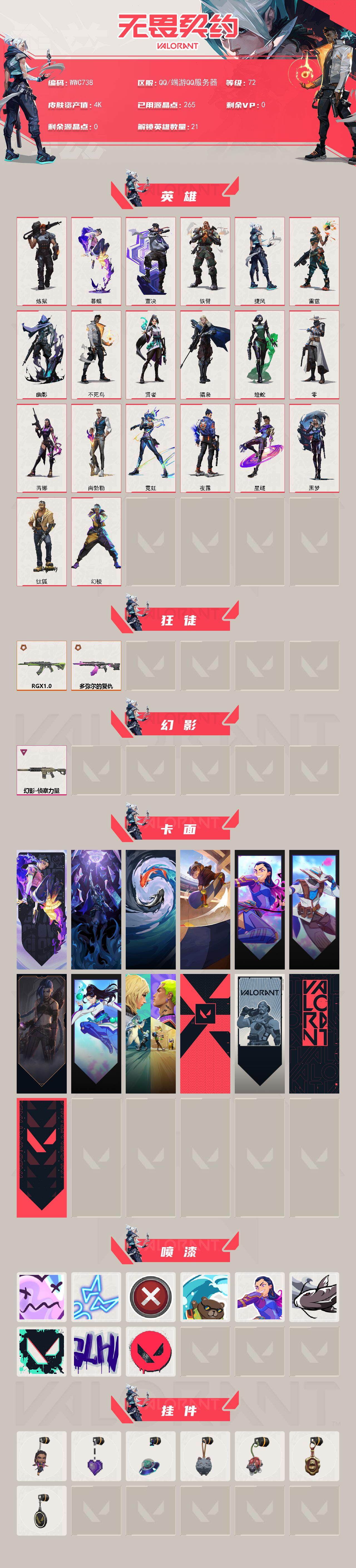【wwc738】终极2/卓越1/皮肤6/等级72/段位:铂金/幻棱/炼狱/暮蝶/钛狐/壹决/铁臂/捷风/雷兹/幽影/不死鸟/贤者/猎枭/蝰蛇/零/芮娜/尚勃勒/霓虹/夜露/星礈/黑梦/狂徒-rgx 11z pro/狂徒-多弥尔的复仇/侦察力量-幻影/无畏契约:暮蝶 卡面/失而复得 卡面/红鳞松叶 卡面/clutch 卡面/无畏契约go!第一卷:芮娜 卡面/无畏契约go!第一卷:零 卡面