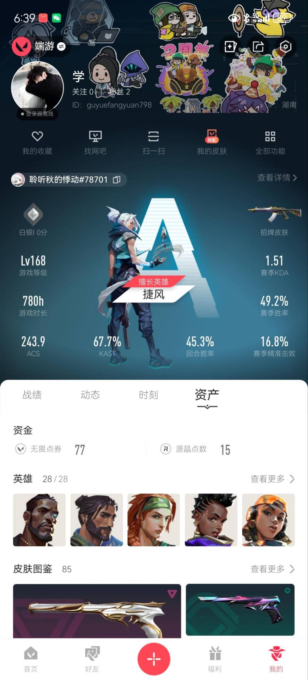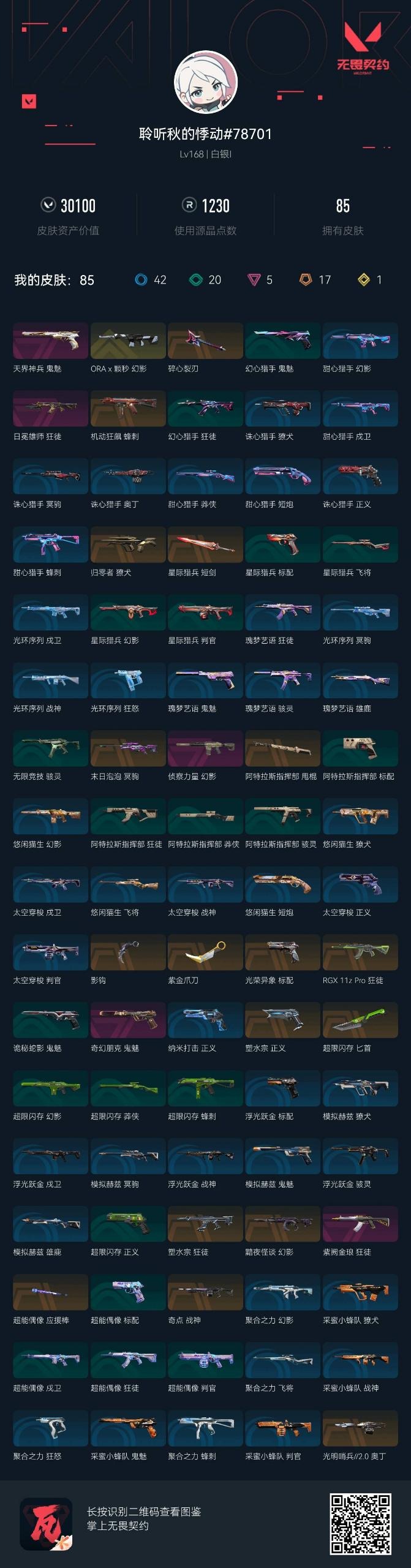 17橙皮 1金皮 5紫皮 85皮肤 28英雄 120卡面 1230已用源晶 白银段位 【近战武器皮肤】:匕首-超限闪存影钩阿特拉斯指挥部星际猎兵 短剑碎心裂刃紫金爪刀超能偶像 应援棒 【佩呛皮肤】:标配-光荣异象正义-塑水宗鬼魅-天界神兵鬼魅-奇幻朋克 【冲锋呛皮肤】:蜂刺-机动