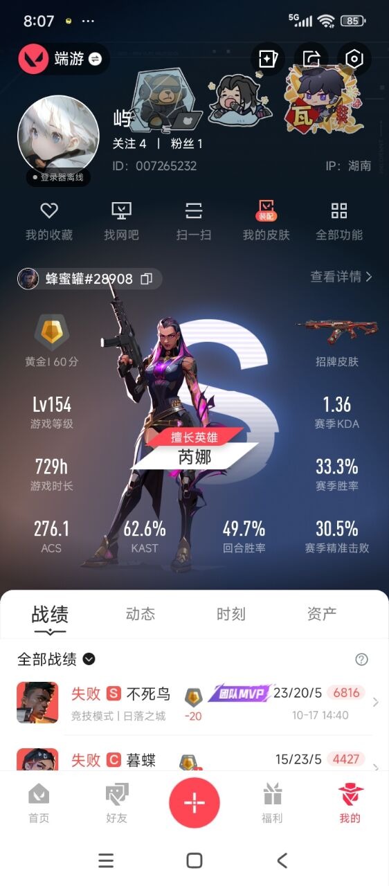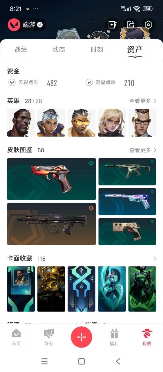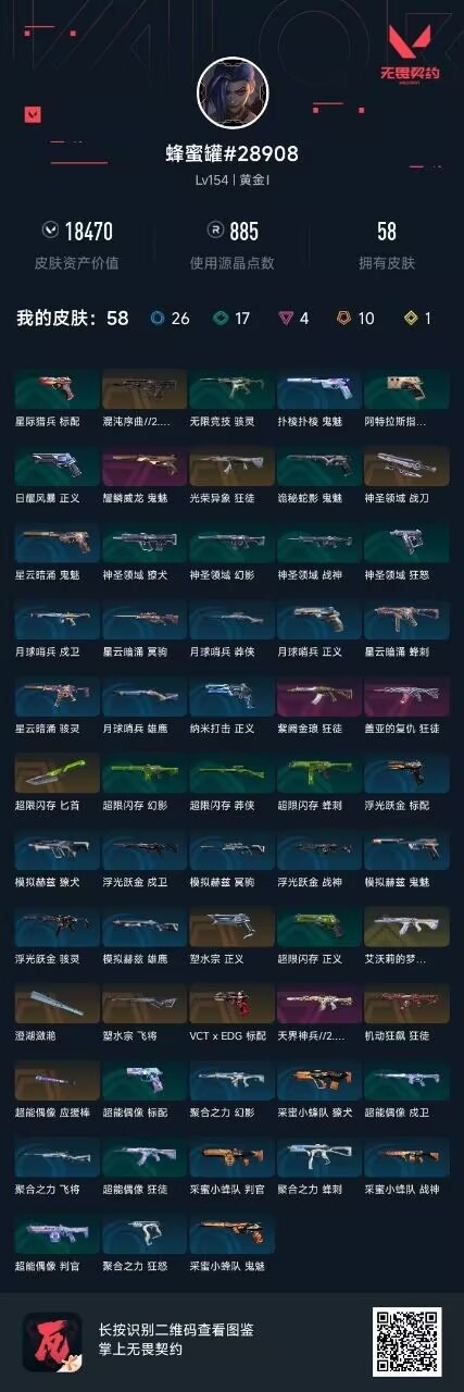 10橙皮 1金皮 4紫皮 58皮肤 28英雄 115卡面 885已用源晶 黄金段位 【近战武器皮肤】:匕首-超限闪存神圣领域 战刀澄湖潋滟超能偶像 应援棒 【佩呛皮肤】:正义-塑水宗鬼魅-耀鳞威龙标配-vctxedg 【步呛皮肤】:狂徒-光荣异象獠犬-混沌序曲2.0狂徒-紫阙金琅狂