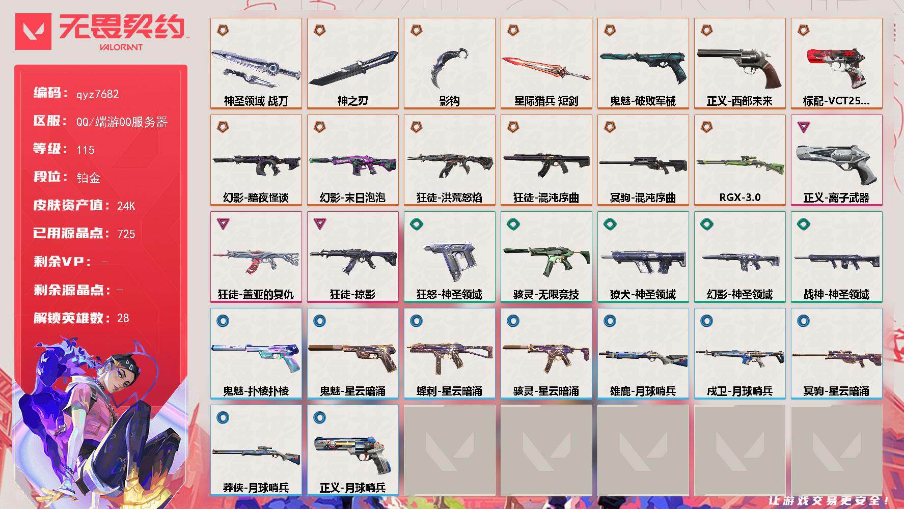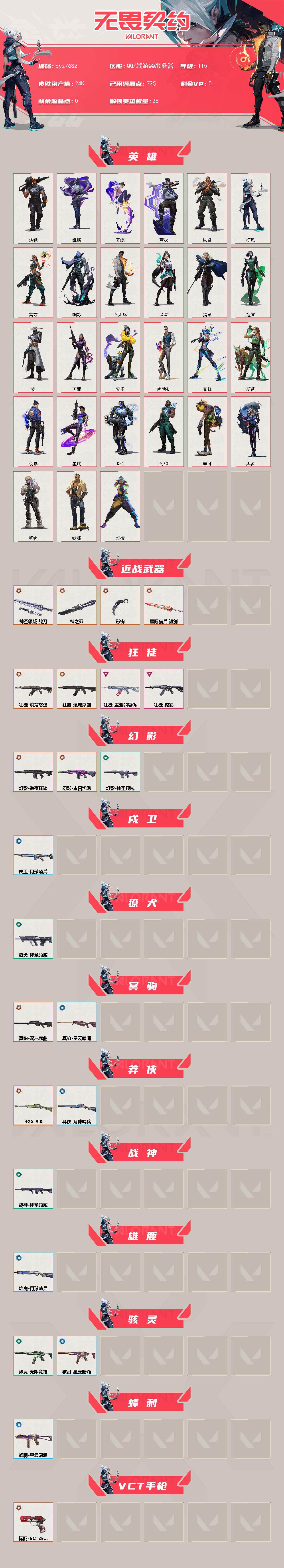 掠夺爪-神之刃-盖亚-混沌-流脓ak-qyz7682-近战武器皮肤:-神圣领域-战刀神之刃影钩-步呛皮肤:-狂徒-盖亚的复仇狂徒-洪荒怒焰狂徒-混沌序曲幻影-黯夜怪谈狂徒-掠影幻影-末日泡泡-佩呛皮肤:-鬼魅-破败军械正义-离子武器标配-vct25xjdg正义-西部未来-狙击呛皮肤:-莽侠-rgx-11z-pro-30冥驹-混沌序曲-亮点:-【qyz7682】【英雄】:幻棱,炼狱,维斯,暮蝶,钛狐,壹决,铁臂,捷风,雷兹,幽影,不死鸟,贤者,猎枭,蝰蛇,零,芮娜,奇乐,尚勃勒,霓虹,斯凯,夜露,星礈,k/o,海神,盖可,黑梦,钢锁【近战-武器】:近战武器-影钩,近战武器-神之刃,近战武器-神圣领域-战刀,近战武器-星际猎兵-短剑【狂徒】:狂徒-洪荒怒焰,狂徒-混沌序曲,狂徒-掠影,狂徒-盖亚的复仇【幻影】:幻影-黯夜怪谈,幻影-末日泡泡,幻影-神圣领域【戍卫】:戍卫-月球哨兵【獠犬】:獠犬-神圣领域【冥驹】:冥驹-混沌序曲,冥驹-星云暗涌【莽侠】:莽侠-rgx-11z-pro//30,莽侠-月球哨兵【战神】:战神-神圣领域【雄鹿】:雄鹿-月球哨兵【骇灵】:骇灵-无限竞技,骇灵-星云暗涌【蜂刺】:蜂刺-星云暗涌【vct手呛】:标配-vct25-x-jdg【正义】:正义-西部未来,正义-离子武器,正义-月球哨兵【鬼魅】:鬼魅-破败军械,鬼魅-扑棱扑棱,鬼魅-星云暗涌【狂怒】:狂怒-神圣领域【卡面】:南瓜盛典-卡面,无畏契约:暮蝶-卡面,树懒大作战-卡面,clutch-卡面,无畏契约:尚勃勒-卡面,无畏契约go!第一卷:芮娜-卡面,无畏契约go!第一卷:零-卡面,别冒尖-卡面,代号红色-卡面,新兵报到-卡面,v契约-卡面,无畏契约-卡面【喷漆】:伤心心-喷漆,尚勃勒-喷漆,分身有术-喷漆,致命优雅-喷漆,买装还是存钱-喷漆,关门放狗-喷漆,暴走萝莉-喷漆,松叶-喷漆,放下武器-喷漆,胜利属于无畏契约-喷漆,glhf-喷漆,无畏契约-喷漆【挂饰】:第九季//第三幕-纪念币-挂饰,无畏契约go!第一卷-芮娜-挂饰,有事联系-挂饰,天外飞客-挂饰,海豹的认可-挂饰,无畏契约-纪念币-挂饰