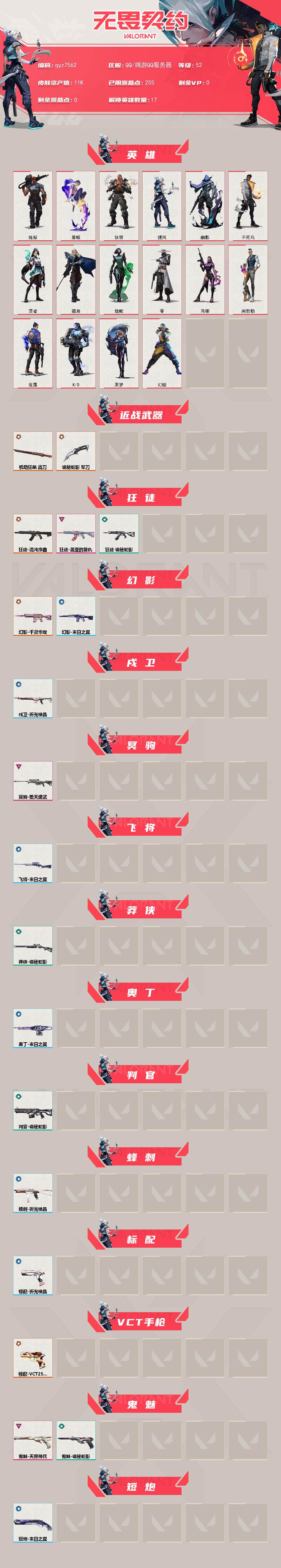 莲花m4/混沌ak/弃王大狙/vct标配天界鬼魅极品组合捡漏小号-qyz7562-近战武器皮肤:-机动狂飙战刀诡秘蛇影-步呛皮肤:-狂徒-盖亚的复仇幻影-千灵华绽狂徒-混沌序曲-佩呛皮肤:-鬼魅-天界神兵标配-vct25xedg-狙击呛皮肤:-冥驹-堕天遗武-亮点:-【qyz7562】莲花m4/混沌ak/弃王大狙/vct标配天界鬼魅极品组合捡漏小号-qyz7562-近战武器皮肤:-机动狂飙战刀诡秘蛇影-步呛皮肤:-狂徒-盖亚的复仇幻影-千灵华绽狂徒-混沌序曲-佩呛皮肤:-鬼魅-天界神兵标配-vct25xedg-狙击呛皮肤:-冥驹-堕天遗武-亮点:-【qyz7562】【英雄】:幻棱,炼狱,暮蝶,铁臂,捷风,幽影,不死鸟,贤者,猎枭,蝰蛇,零,芮娜,尚勃勒,夜露,k/o,黑梦【近战-武器】:近战武器-机动狂飙-战刀,近战武器-诡秘蛇影-军刀【狂徒】:狂徒-混沌序曲,狂徒-盖亚的复仇,狂徒-诡秘蛇影【幻影】:幻影-千灵华绽,幻影-末日之翼【戍卫】:戍卫-折光棱晶【冥驹】:冥驹-堕天遗武【飞将】:飞将-末日之翼【莽侠】:莽侠-诡秘蛇影【奥丁】:奥丁-末日之翼【判官】:判官-诡秘蛇影【蜂刺】:蜂刺-折光棱晶【标配】:标配-折光棱晶【vct手呛】:标配-vct25-x-edg【鬼魅】:鬼魅-天界神兵,鬼魅-诡秘蛇影【短炮】:短炮-末日之翼【卡面】:树懒大作战-卡面,无畏契约go!第一卷:芮娜-卡面,无畏契约go!第一卷:零-卡面,无垠星环-卡面,《双城之战》金克丝-卡面,无畏契约go!第一卷:贤者-卡面,代号红色-卡面,新兵报到-卡面,v契约-卡面,无畏契约-卡面【喷漆】:买装还是存钱-喷漆,无畏契约go!第一卷:芮娜-喷漆,放下武器-喷漆,胜利属于无畏契约-喷漆,glhf-喷漆,无畏契约-喷漆【挂饰】:动力机箱-挂饰,vct-x-edg-挂饰,天外飞客-挂饰,《双城之战》魄罗-挂饰,无畏契约-纪念币-挂饰