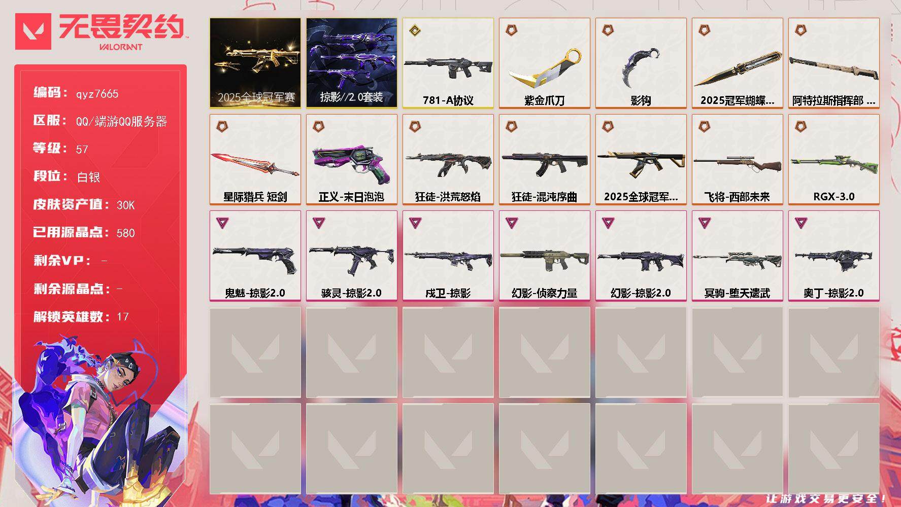 25-掠夺20-套装-紫金爪-qyz7665-套装:-掠影20套装-近战武器皮肤:-紫金爪刀影钩-步呛皮肤:-幻影-侦察力量幻影-781-a协议狂徒-洪荒怒焰狂徒-混沌序曲戍卫-掠影幻影-掠影20-佩呛皮肤:-鬼魅-掠影20正义-末日泡泡-狙击呛皮肤:-冥驹-堕天遗武莽侠-rgx-11z-pro-30飞将-西部未来-冲锋呛皮肤:-骇灵-掠影20-机呛皮肤:-奥丁-掠影20-亮点:-【qyz7665】【套装】:2025全球冠军赛套装,掠影//20套装【英雄】:幻棱,炼狱,暮蝶,壹决,捷风,雷兹,幽影,不死鸟,贤者,猎枭,芮娜,尚勃勒,霓虹,夜露,盖可,黑梦【近战-武器】:近战武器-2025全球冠军赛-蝴蝶刀,近战武器-影钩,近战武器-紫金爪刀,近战武器-阿特拉斯指挥部-甩棍,近战武器-星际猎兵-短剑【狂徒】:狂徒-2025全球冠军赛,狂徒-洪荒怒焰,狂徒-混沌序曲【幻影】:幻影-781-a协议,幻影-侦察力量,幻影-掠影//20【戍卫】:戍卫-掠影【冥驹】:冥驹-堕天遗武【飞将】:飞将-西部未来【莽侠】:莽侠-rgx-11z-pro//30【奥丁】:奥丁-掠影//20【骇灵】:骇灵-掠影//20【正义】:正义-末日泡泡【鬼魅】:鬼魅-掠影//20【卡面】:树懒大作战-卡面,红鳞松叶-卡面,无畏契约go!第一卷:芮娜-卡面,无畏契约go!第一卷:零-卡面,《双城之战》金克丝-卡面,代号红色-卡面,新兵报到-卡面,v契约-卡面,无畏契约-卡面【喷漆】:买装还是存钱-喷漆,关门放狗-喷漆,胜利属于无畏契约-喷漆,glhf-喷漆,无畏契约-喷漆【挂饰】:无畏契约go!第一卷-芮娜-挂饰,无畏契约go!第一卷-零-挂饰,鱼骨头-挂饰,天外飞客-挂饰,无畏契约-纪念币-挂饰