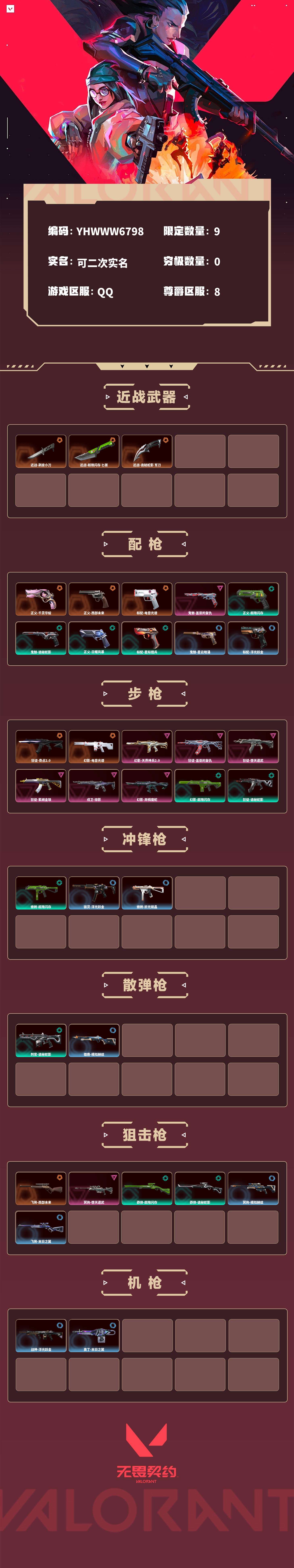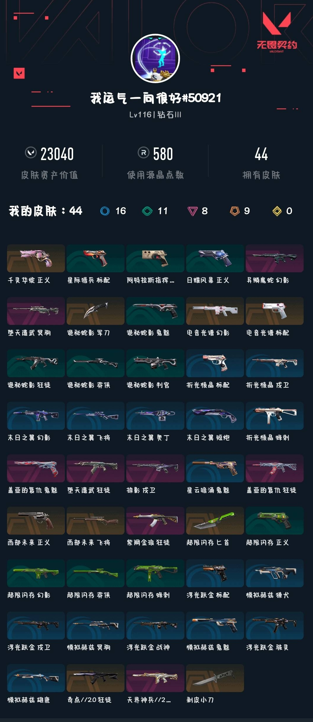 【无畏契约】【yhwww6798】等级:116,已用无畏点23040,已用源晶点580,橙皮:近战-剥皮小刀|近战-超限闪存 匕首|正义-千灵华绽|狂徒-奇点2.0|飞将-西部未来|正义-西部未来|近战-诡秘蛇影 军刀|标配-电音光谱|幻影-电音光谱__紫皮:鬼魅-盖亚的复仇|幻影-天界神兵2.0|狂徒-盖亚的复仇|狂徒-堕天遗武|冥驹-堕天遗武|狂徒-紫阙金琅|戍卫-掠影|幻影-异鳞魔蛇__段位:钻石__蓝皮:鬼魅-星云暗涌|骇灵-浮光跃金|标配-浮光跃金|戍卫-浮光跃金|战神-浮光跃金|鬼魅-模拟赫兹|獠犬-模拟赫兹|冥驹-模拟赫兹|雄鹿-模拟赫兹|蜂刺-折光棱晶|戍卫-折光棱晶|标配-折光棱晶|飞将-末日之翼|幻影-末日之翼|短炮-末日之翼|奥丁-末日之翼|标配-阿特拉斯指挥部__绿皮:正义-超限闪存|莽侠-超限闪存|幻影-超限闪存|蜂刺-超限闪存|判官-诡秘蛇影|鬼魅-诡秘蛇影|莽侠-诡秘蛇影|狂徒-诡秘蛇影|正义-日耀风暴|标配-星际猎兵__英雄:尚勃勒|维斯|黑梦|斯凯|暮蝶|盖可|霓虹|壹决|星礈|k/o|幽影|夜露|钢锁|海神|奇乐|炼狱|铁臂|贤者|猎枭|钛狐|芮娜|零|捷风|蝰蛇|不死鸟|幻棱|雷兹|禁灭