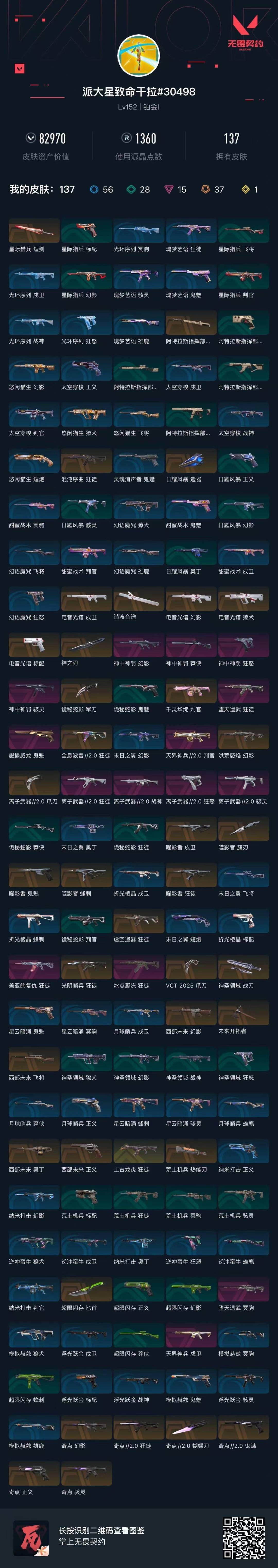 [14361275]37橙皮 1金皮 15紫皮 137皮肤 28英雄 143卡面 1360已用源晶 铂金段位 【套装】:奇点//2.0套装神罚套装电音光谱神中神罚套装离子武器2.0噬影者vct 2025赛季礼包西部未来vctcn2025套装 【近战武器皮肤】:匕首-超限闪存神之刃蝴蝶刀-奇点//2.0谐波音谱阿特拉斯指挥部神圣领域 战刀离子武器2.0 爪刀噬影者簇刃vct 2025 爪刀未来开拓者荒土机兵热能刀诡秘蛇影星际猎兵 短剑 【佩呛皮肤】:鬼魅-奇点//2.0鬼魅-噬影者狂怒-离子武器2.0狂怒-神中神罚标配-电音光谱正义-西部未来正义-奇点鬼魅-耀鳞威龙 【冲锋呛皮肤】:骇灵-神中神罚骇灵-离子武器2.0蜂刺-噬影者骇灵-奇点 【霰弹呛皮肤】:判官-天界神兵2.0判官-千灵华绽 【步呛皮肤】:狂徒-噬影者幻影-西部未来狂徒-上古龙炎狂徒-离子武器2.0狂徒-混沌序曲狂徒-光明哨兵狂徒-奇点//2.0戍卫-噬影者狂徒-虚空遗器幻影-神中神罚幻影-电音光谱戍卫-电音光谱獠犬-电音光谱狂徒-盖亚的复仇狂徒-全息波普//2.0狂徒-冰点凝冻狂徒-堕天遗武幻影-奇点幻影-洪荒怒焰戍卫-天界神兵 【狙击呛皮肤】:飞将-西部未来莽侠-神中神罚冥驹-堕天遗武 【机呛皮肤】:战神-离子武器2.0奥丁-西部未来 【挂饰】:薰衣草之心挂饰西部未来挂饰双城之战小蛋糕挂饰双城之战魄罗挂饰神中神罚挂饰神中神挂饰奇点2.0挂饰vct2025emea联赛挂饰vct2025太平洋联赛挂饰vct2025美洲联赛挂饰vct2025cn联赛挂饰终章ko小金人挂饰