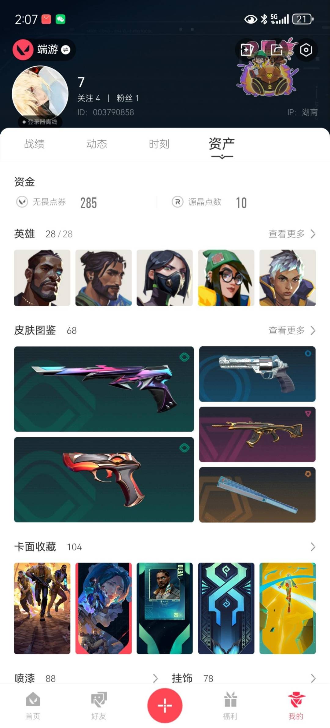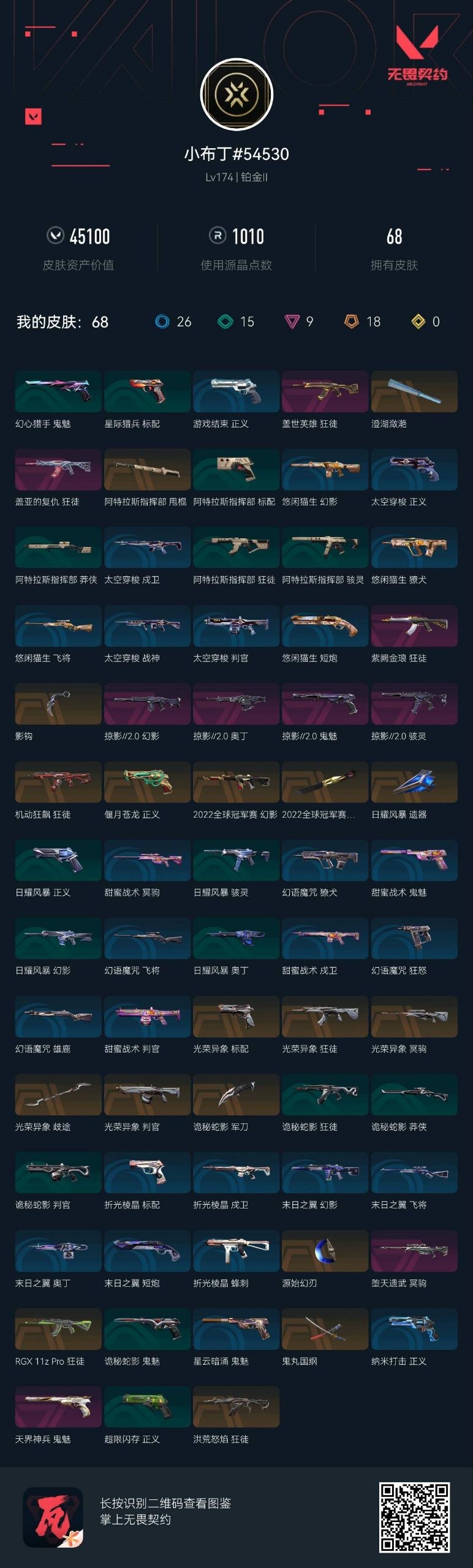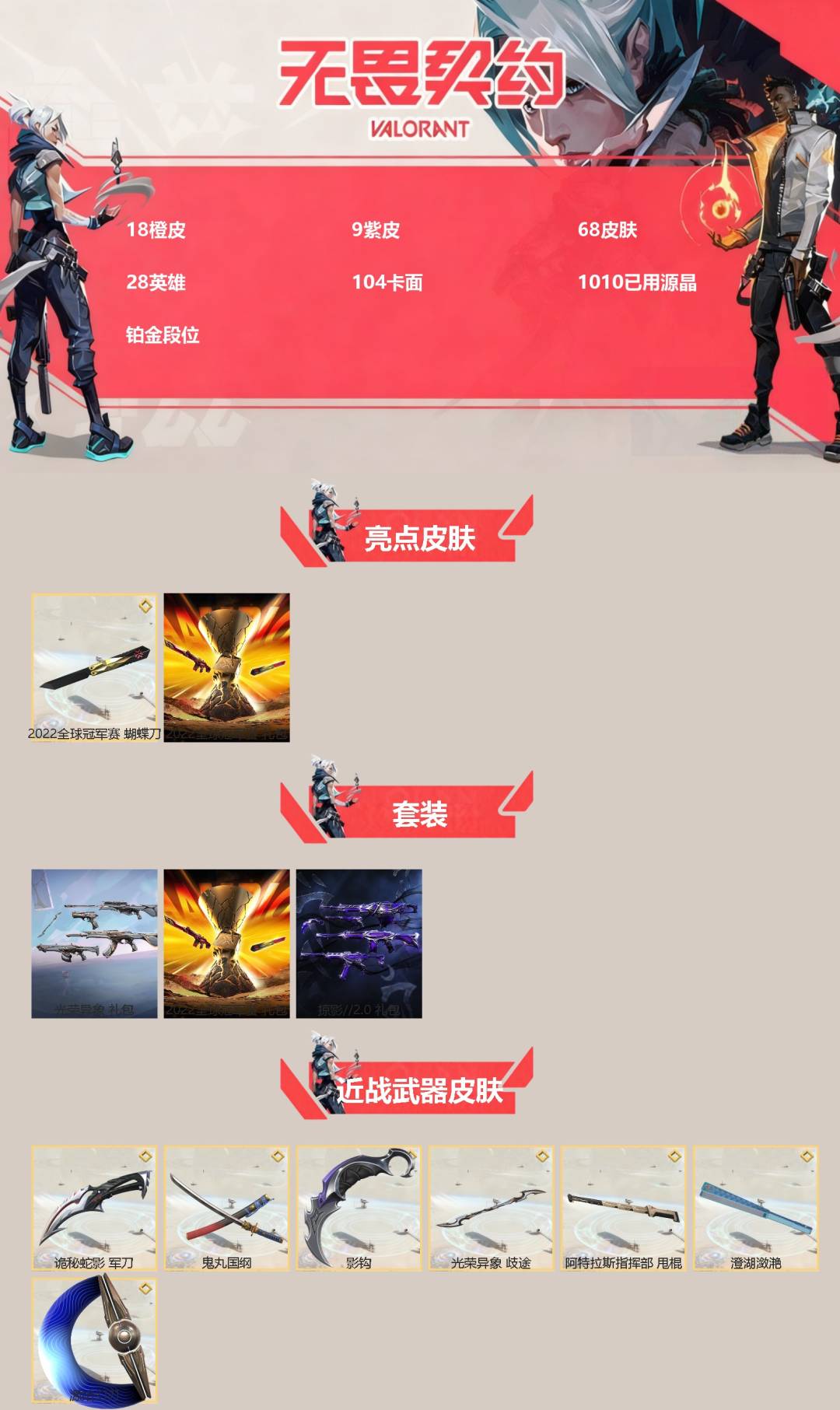 18橙皮 9紫皮 68皮肤 28英雄 104卡面 1010已用源晶 铂金段位 【亮点皮肤】:幻影-2022全球冠军赛蝴蝶刀-2022全球冠军赛 【套装】:光荣异象掠影2.0套装2022全球冠军赛 【近战武器皮肤】:歧途影钩诡秘蛇影源始幻刃鬼丸国纲阿特拉斯指挥部澄湖潋滟 【佩呛皮肤