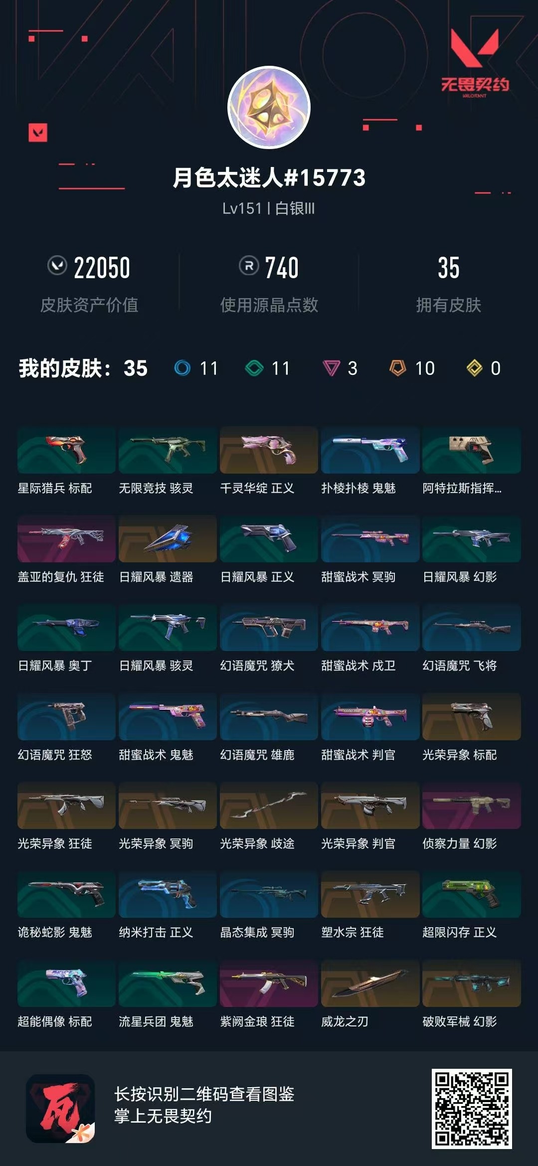 10橙皮 3紫皮 35皮肤 28英雄 77卡面 740已用源晶 白银段位 【套装】:光荣异象 【近战武器皮肤】:歧途威龙之刃 【佩呛皮肤】:标配-光荣异象正义-千灵华绽 【霰弹呛皮肤】:判官-光荣异象 【步呛皮肤】:狂徒-光荣异象狂徒-紫阙金琅狂徒-盖亚的复仇狂徒-塑水宗幻影-侦察力量