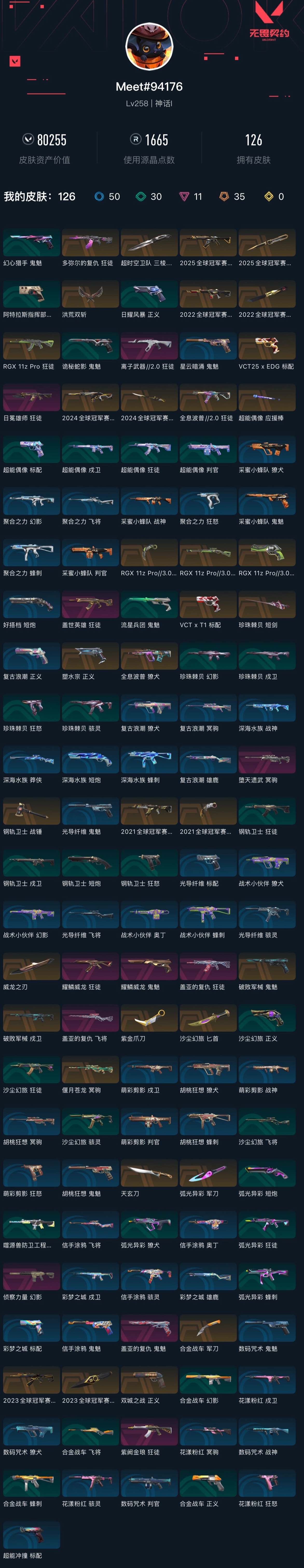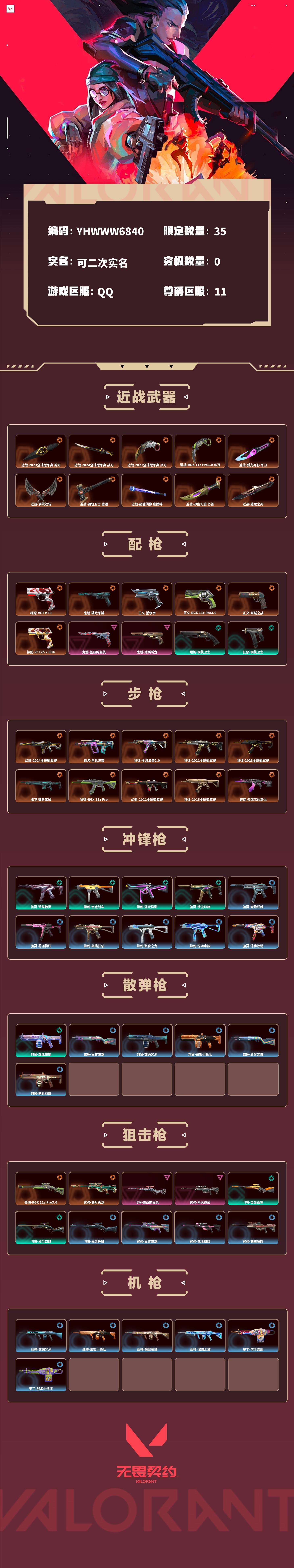【无畏契约】【yhwww6840】等级:259,已用无畏点80255,已用源晶点1665,橙皮:标配-vct x t1|鬼魅-破败军械|幻影-2024全球冠军赛|近战-2023全球冠军赛 苦无|近战-2024全球冠军赛 战刀|近战-2021全球冠军赛 爪刀|近战-rgx 11z pro3.0 爪刀|近战-弧光异彩 军刀|近战-洪荒双斩|近战-钢轨卫士 战锤|近战-超能偶像 应援棒|近战-沙尘幻旅 匕首|近战-威龙之刃|近战-天玄刀|近战-珍珠棘贝 短剑|近战-紫金爪刀|獠犬-全息波普|莽侠-rgx 11z pro3.0|狂徒-全息波普2.0|狂徒-2021全球冠军赛|狂徒-2023全球冠军赛|正义-塑水宗|戍卫-破败军械|正义-rgx 11z pro3.0|正义-双城之战|冥驹-偃月苍龙|近战-合金战车 军刀|标配-vct25 x edg|狂徒-rgx 11z pro|近战-2022全球冠军赛 蝴蝶刀|幻影-2022全球冠军赛|近战-超时空卫队 三棱军刺|狂徒-2025全球冠军赛|近战-2025全球冠军赛 蝴蝶刀|狂徒-多弥尔的复仇__紫皮:飞将-盖亚的复仇|鬼魅-盖亚的复仇|鬼魅-耀鳞威龙|狂徒-日冕雄师|狂徒-盖世英雄|幻影-侦察力量|狂徒-盖亚的复仇|冥驹-堕天遗武|狂徒-耀鳞威龙|狂徒-紫阙金琅|狂徒-离子武器2.0__绿皮:短炮-钢轨卫士|骇灵-珍珠棘贝|幻影-珍珠棘贝|狂怒-钢轨卫士|狂徒-钢轨卫士|狂怒-珍珠棘贝|戍卫-钢轨卫士|戍卫-珍珠棘贝|蜂刺-合金战车|正义-合金战车|幻影-合金战车|飞将-合金战车|戍卫-超能偶像|标配-超能偶像|狂徒-超能偶像|判官-超能偶像|短炮-弧光异彩|獠犬-弧光异彩|蜂刺-弧光异彩|狂徒-弧光异彩|鬼魅-流星兵团|正义-沙尘幻旅|狂徒-沙尘幻旅|飞将-沙尘幻旅|骇灵-沙尘幻旅|幻影-噬源兽防卫工程|鬼魅-诡秘蛇影|正义-日耀风暴|鬼魅-幻心猎手__蓝皮:鬼魅-光导纤维|飞将-光导纤维|标配-光导纤维|骇灵-光导纤维|獠犬-复古浪潮|冥驹-复古浪潮|雄鹿-复古浪潮|正义-复古浪潮|标配-超能冲撞|短炮-好搭档|狂怒-花漾粉红|骇灵-花漾粉红|戍卫-花漾粉红|冥驹-花漾粉红|战神-数码咒术|獠犬-数码咒术|判官-数码咒术|鬼魅-数码咒术|鬼魅-星云暗涌|鬼魅-采蜜小蜂队|战神-采蜜小蜂队|獠犬-采蜜小蜂队|判官-采蜜小蜂队|戍卫-彩梦之城|雄鹿-彩梦之城|标配-彩梦之城|鬼魅-胡桃狂想|獠犬-胡桃狂想|蜂刺-胡桃狂想|冥驹-胡桃狂想|蜂刺-聚合之力|幻影-聚合之力|狂怒-聚合之力|飞将-聚合之力|戍卫-萌彩剪影|战神-萌彩剪影|狂怒-萌彩剪影|判官-萌彩剪影|战神-深海水族|短炮-深海水族|蜂刺-深海水族|莽侠-深海水族|鬼魅-信手涂鸦|骇灵-信手涂鸦|奥丁-信手涂鸦|飞将-信手涂鸦|蜂刺-战术小伙伴|幻影-战术小伙伴|獠犬-战术小伙伴|奥丁-战术小伙伴|标配-阿特拉斯指挥部__段位:神话__英雄:尚勃勒|维斯|黑梦|斯凯|暮蝶|盖可|霓虹|壹决|星礈|k/o|幽影|夜露|钢锁|海神|奇乐|炼狱|铁臂|贤者|猎枭|钛狐|芮娜|零|捷风|蝰蛇|不死鸟|幻棱|雷兹|禁灭
