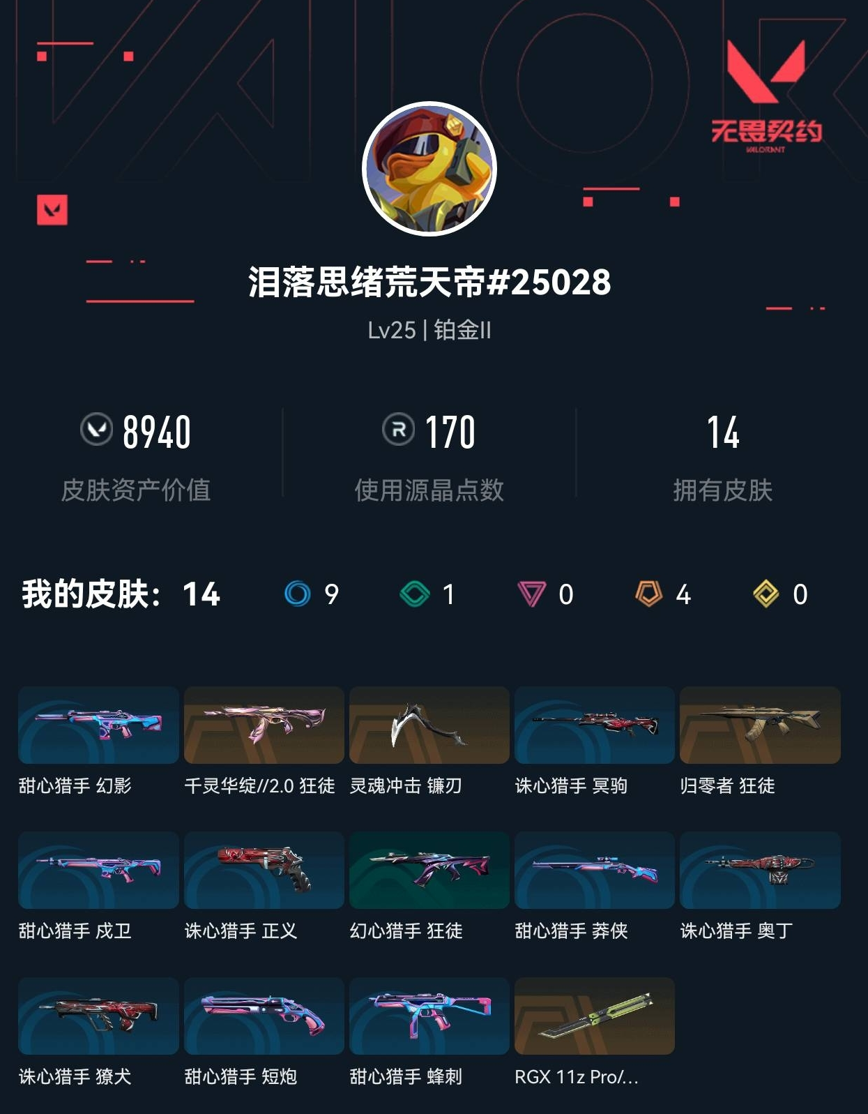 【无畏契约】【yhwww6835】等级:25,已用无畏点8940,已用源晶点170,橙皮:近战-灵魂冲击 镰刃|狂徒-归零者|近战-rgx 11z pro2.0 蝴蝶刀__段位:铂金__英雄:尚勃勒|暮蝶|霓虹|壹决|炼狱|贤者|猎枭|芮娜|零|捷风|蝰蛇|不死鸟|雷兹__蓝皮:蜂刺-甜心猎手|短炮-甜心猎手|莽侠-甜心猎手|幻影-甜心猎手|戍卫-甜心猎手|正义-诛心猎手|冥驹-诛心猎手|獠犬-诛心猎手|奥丁-诛心猎手__绿皮:狂徒-幻心猎手