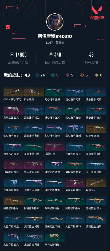 【无畏契约】【yhwww6808】等级:67,已用无畏点14800,已用源晶点440,橙皮:冥驹-归零者|近战-阿特拉斯指挥部 甩棍|近战-魔术火花|近战-a x 颗秒 军刀__紫皮:狂徒-日冕雄师|狂徒-堕天遗武|狂徒-紫阙金琅|正义-离子武器|狂徒-掠影__段位:黄金__蓝皮:正义-太空穿梭|战神-太空穿梭|判官-太空穿梭|戍卫-太空穿梭|骇灵-阿特拉斯指挥部|莽侠-阿特拉斯指挥部|标配-阿特拉斯指挥部|狂徒-阿特拉斯指挥部|狂怒-光环序列|戍卫-光环序列|战神-光环序列|狂徒-瑰梦艺语|鬼魅-瑰梦艺语|骇灵-瑰梦艺语|雄鹿-瑰梦艺语|蜂刺-甜心猎手|短炮-甜心猎手|莽侠-甜心猎手|幻影-甜心猎手|戍卫-甜心猎手|正义-诛心猎手|冥驹-诛心猎手|獠犬-诛心猎手|奥丁-诛心猎手__绿皮:短炮-悠闲猫生|飞将-悠闲猫生|幻影-悠闲猫生|獠犬-悠闲猫生|判官-星际猎兵|飞将-星际猎兵|狂徒-幻心猎手|鬼魅-幻心猎手__英雄:尚勃勒|维斯|黑梦|暮蝶|壹决|k/o|夜露|钢锁|炼狱|铁臂|贤者|猎枭|芮娜|零|捷风|不死鸟|禁灭