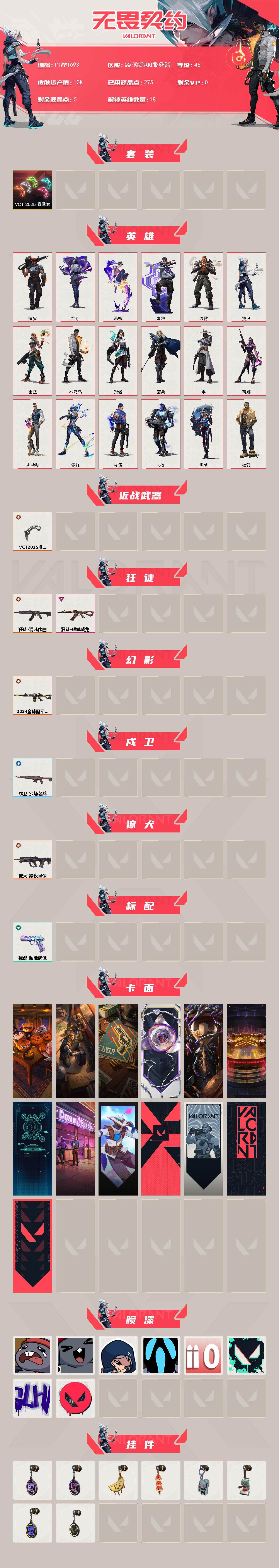 【ptww1693】【最新上架】 【套装】:vct 2025 赛季套装 【英雄】:炼狱,维斯,暮蝶,钛狐,壹决,铁臂,捷风,雷兹,不死鸟,贤者,猎枭,零,芮娜,尚勃勒,霓虹,夜露,k/o,黑梦 【近战 武器】:近战武器-vct 2025 爪刀 【狂徒】:狂徒-混沌序曲,狂徒-耀鳞威龙 【幻影】:幻影-2024全球冠军赛 【戍卫】:戍卫-沙场老兵 【獠犬】:獠犬-黯夜怪谈 【标配】:标配-超能偶