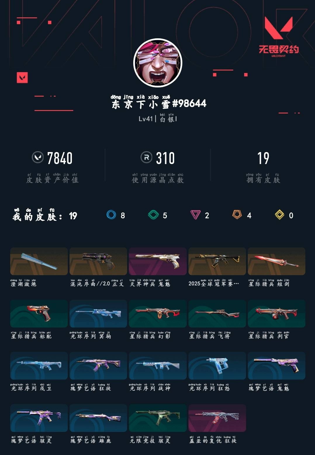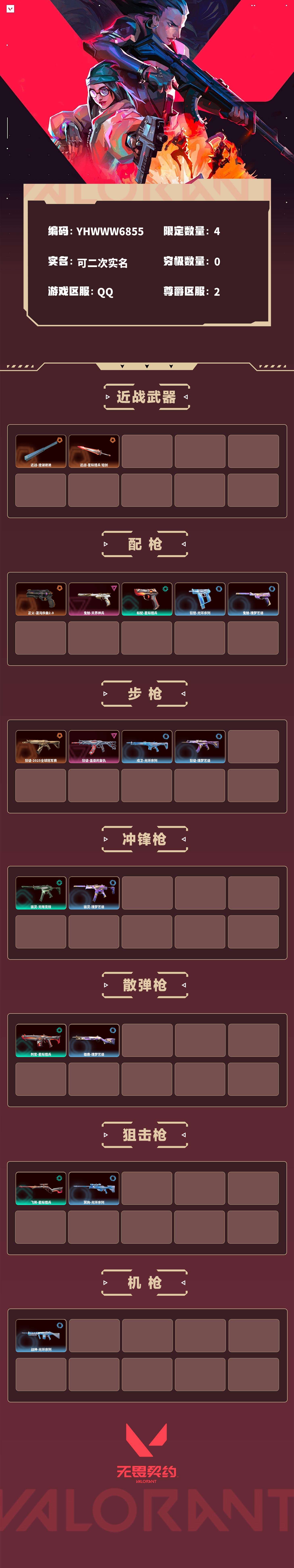 【无畏契约】【yhwww6855】等级:41,已用无畏点7840,已用源晶点310,橙皮:近战-澄湖潋滟|近战-星际猎兵 短剑|狂徒-2025全球冠军赛|正义-混沌序曲2.0__紫皮:鬼魅-天界神兵|狂徒-盖亚的复仇__段位:白银__绿皮:骇灵-无限竞技|判官-星际猎兵|飞将-星际猎兵|标配-星际猎兵__蓝皮:狂怒-光环序列|戍卫-光环序列|冥驹-光环序列|战神-光环序列|狂徒-瑰梦艺语|鬼魅-瑰梦艺语|骇灵-瑰梦艺语|雄鹿-瑰梦艺语__英雄:尚勃勒|暮蝶|盖可|霓虹|壹决|幽影|钢锁|炼狱|贤者|猎枭|芮娜|零|捷风|不死鸟|雷兹|禁灭