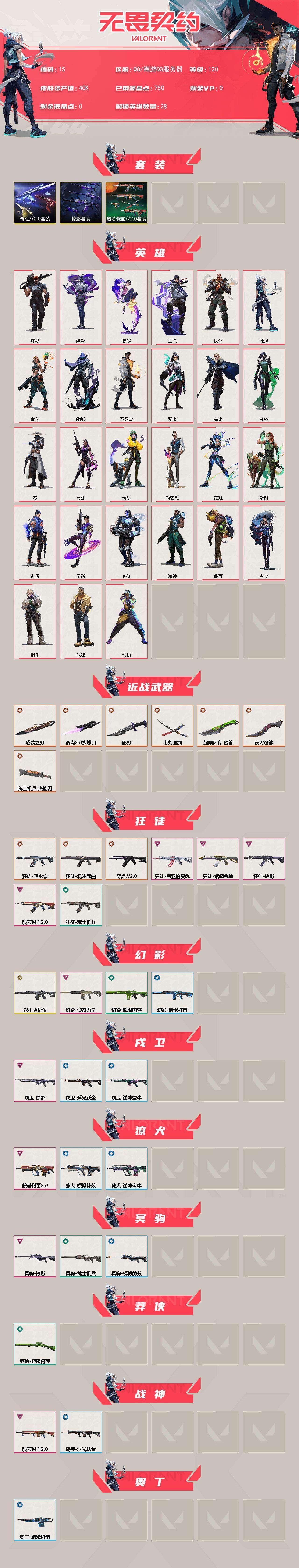 【游戏等级】lv120 【段位】 铂金i 【r点】750 【皮肤总价值】40630 【英雄数量】28 【皮肤数量】52 【挂饰数量】62 【卡面数量】89 【喷漆数量】66 【鬼魅】鬼魅-幻心猎手 鬼魅-扑棱扑棱 鬼魅-模拟赫兹 鬼魅-奇点//2.0 【标配】标配-星际猎兵 标配-阿特拉斯指挥部 标配-荒土机兵 标配-浮光跃金 【幻影】幻影-侦察力量 幻影-纳米打击 幻影-