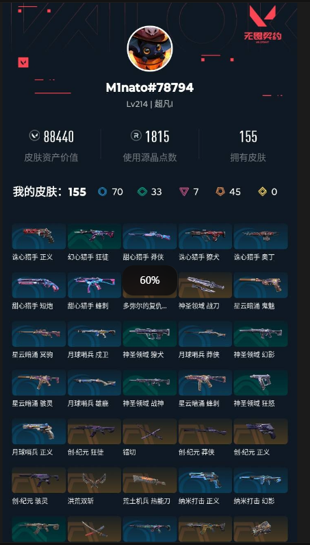 【无畏契约】【yhwww6675】等级:214,已用无畏点88440,已用源晶点1815,橙皮:标配-vct x lev|骇灵-洪荒怒焰|短炮-洪荒怒焰|幻影-2024全球冠军赛|幻影-千灵华绽|近战-2021全球冠军赛 爪刀|幻影-光明哨兵2.0|近战-rgx 11z pro3.0 爪刀|近战-超限闪存 匕首|近战-洪荒双斩|近战-钢轨卫士 战锤|近战-澄湖潋滟|近战-超能偶像 应援棒|近战-堕天遗武 仪式匕首|近战-流星兵团 短剑|近战-落英飞旋|近战-沙尘幻旅 匕首|近战-威龙之刃|近战-夜刃诡镰|近战-天御刀|近战-珍珠棘贝 短剑|莽侠-rgx 11z pro3.0|狂徒-归零者|狂徒-2021全球冠军赛|狂徒-塑水宗|狂徒-洪荒怒焰|獠犬-归零者|狂徒-混沌序曲|正义-rgx 11z pro3.0|判官-千灵华绽|正义-千灵华绽|狂徒-奇点2.0|鬼魅-奇点2.0|近战-奇点2.0 蝴蝶刀|近战-荒土机兵 热能刀|狂徒-双城之战|近战-双城之战 拳套|近战-鬼丸国纲|近战-镭切|骇灵-创·纪元|莽侠-创·纪元|狂徒-创·纪元|正义-创·纪元|近战-神圣领域 战刀|狂徒-多弥尔的复仇__紫皮:鬼魅-耀鳞威龙|狂徒-日冕雄师|狂徒-盖亚的复仇|冥驹-堕天遗武|戍卫-天界神兵|狂徒-耀鳞威龙|狂徒-紫阙金琅__绿皮:短炮-钢轨卫士|骇灵-珍珠棘贝|幻影-珍珠棘贝|狂怒-钢轨卫士|狂徒-钢轨卫士|狂怒-珍珠棘贝|戍卫-钢轨卫士|戍卫-珍珠棘贝|狂徒-荒土机兵|标配-荒土机兵|骇灵-荒土机兵|冥驹-荒土机兵|獠犬-神圣领域|狂怒-神圣领域|战神-神圣领域|幻影-神圣领域|戍卫-超能偶像|标配-超能偶像|狂徒-超能偶像|判官-超能偶像|正义-超限闪存|莽侠-超限闪存|幻影-超限闪存|蜂刺-超限闪存|骇灵-流星兵团|鬼魅-流星兵团|狂徒-流星兵团|奥丁-流星兵团|正义-沙尘幻旅|狂徒-沙尘幻旅|飞将-沙尘幻旅|骇灵-沙尘幻旅|狂徒-幻心猎手__蓝皮:鬼魅-光导纤维|飞将-光导纤维|标配-光导纤维|骇灵-光导纤维|獠犬-复古浪潮|冥驹-复古浪潮|雄鹿-复古浪潮|正义-复古浪潮|判官-纳米打击|正义-纳米打击|奥丁-纳米打击|幻影-纳米打击|雄鹿-逆冲蛮牛|狂怒-逆冲蛮牛|戍卫-逆冲蛮牛|獠犬-逆冲蛮牛|鬼魅-星云暗涌|骇灵-星云暗涌|正义-月球哨兵|莽侠-月球哨兵|戍卫-月球哨兵|雄鹿-月球哨兵|鬼魅-采蜜小蜂队|战神-采蜜小蜂队|獠犬-采蜜小蜂队|判官-采蜜小蜂队|骇灵-浮光跃金|标配-浮光跃金|戍卫-浮光跃金|战神-浮光跃金|鬼魅-胡桃狂想|獠犬-胡桃狂想|蜂刺-胡桃狂想|冥驹-胡桃狂想|蜂刺-聚合之力|幻影-聚合之力|狂怒-聚合之力|飞将-聚合之力|戍卫-萌彩剪影|战神-萌彩剪影|狂怒-萌彩剪影|判官-萌彩剪影|鬼魅-模拟赫兹|獠犬-模拟赫兹|冥驹-模拟赫兹|雄鹿-模拟赫兹|战神-深海水族|短炮-深海水族|蜂刺-深海水族|莽侠-深海水族|莽侠-纤云弄巧|正义-纤云弄巧|短炮-纤云弄巧|蜂刺-纤云弄巧|冥驹-星云暗涌|蜂刺-星云暗涌|蜂刺-战术小伙伴|幻影-战术小伙伴|獠犬-战术小伙伴|奥丁-战术小伙伴|飞将-战术熊与伙伴们|狂怒-战术熊与伙伴们|戍卫-战术熊与伙伴们|标配-战术熊与伙伴们|蜂刺-甜心猎手|短炮-甜心猎手|莽侠-甜心猎手|正义-诛心猎手|獠犬-诛心猎手|奥丁-诛心猎手__段位:超凡__英雄:尚勃勒|维斯|黑梦|斯凯|暮蝶|盖可|霓虹|壹决|星礈|k/o|幽影|夜露|钢锁|海神|奇乐|炼狱|铁臂|贤者|猎枭|钛狐|芮娜|零|捷风|蝰蛇|不死鸟|幻棱|雷兹|禁灭