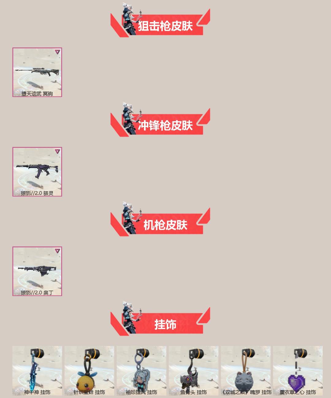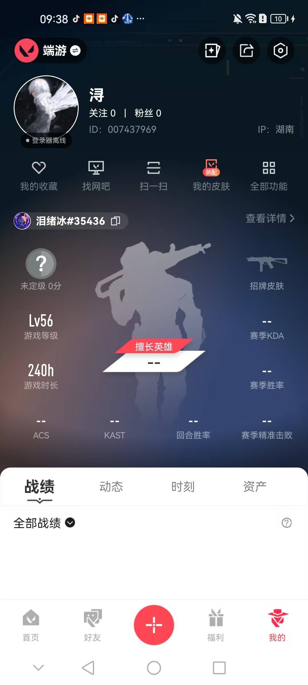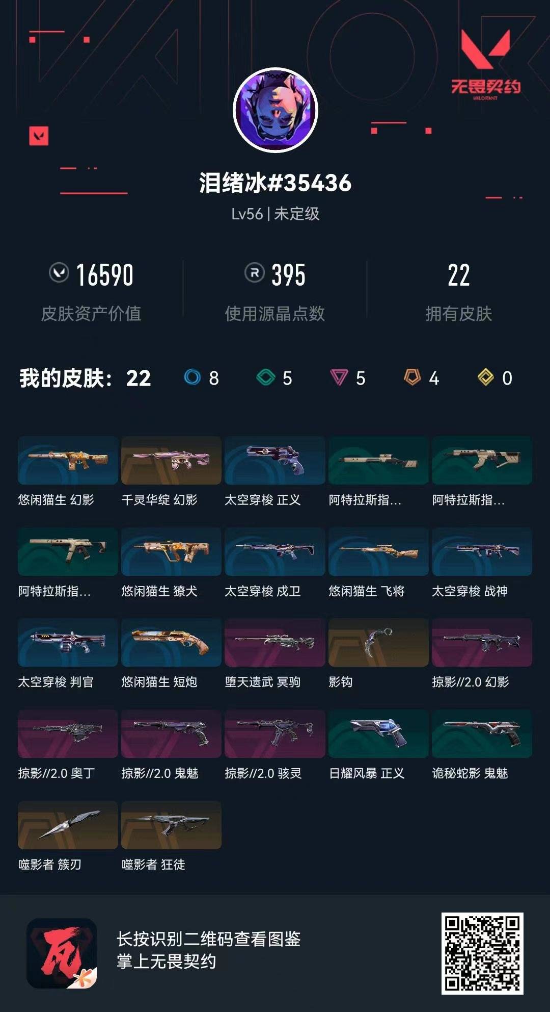 4橙皮 5紫皮 22皮肤 14英雄 46卡面 395已用源晶 未定级段位 【套装】:掠影2.0套装 【近战武器皮肤】:噬影者簇刃影钩 【佩呛皮肤】:鬼魅-掠影2.0 【冲锋呛皮肤】:骇灵-掠影2.0 【步呛皮肤】:狂徒-噬影者幻影-掠影2.0幻影-千灵华绽 【狙击呛皮肤】:冥驹-堕天遗武 【