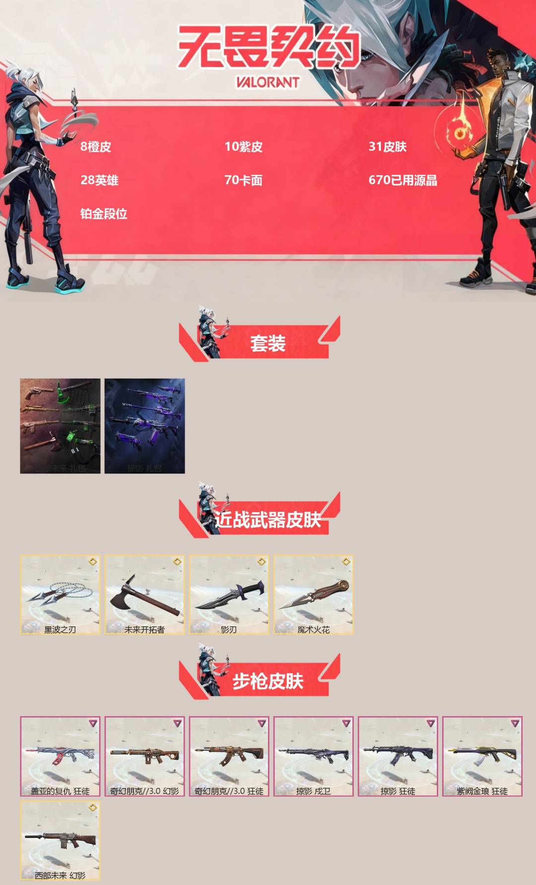[14399979]8橙皮 10紫皮 31皮肤 28英雄 70卡面 670已用源晶 铂金段位 【套装】:掠影套装西部未来 【近战武器皮肤】:影刃未来开拓者魔术火花黑波之刃 【佩呛皮肤】:正义-掠影正义-西部未来鬼魅-天界神兵 【霰弹呛皮肤】:雄鹿-离子武器 【步呛皮肤】:幻影-西部未来