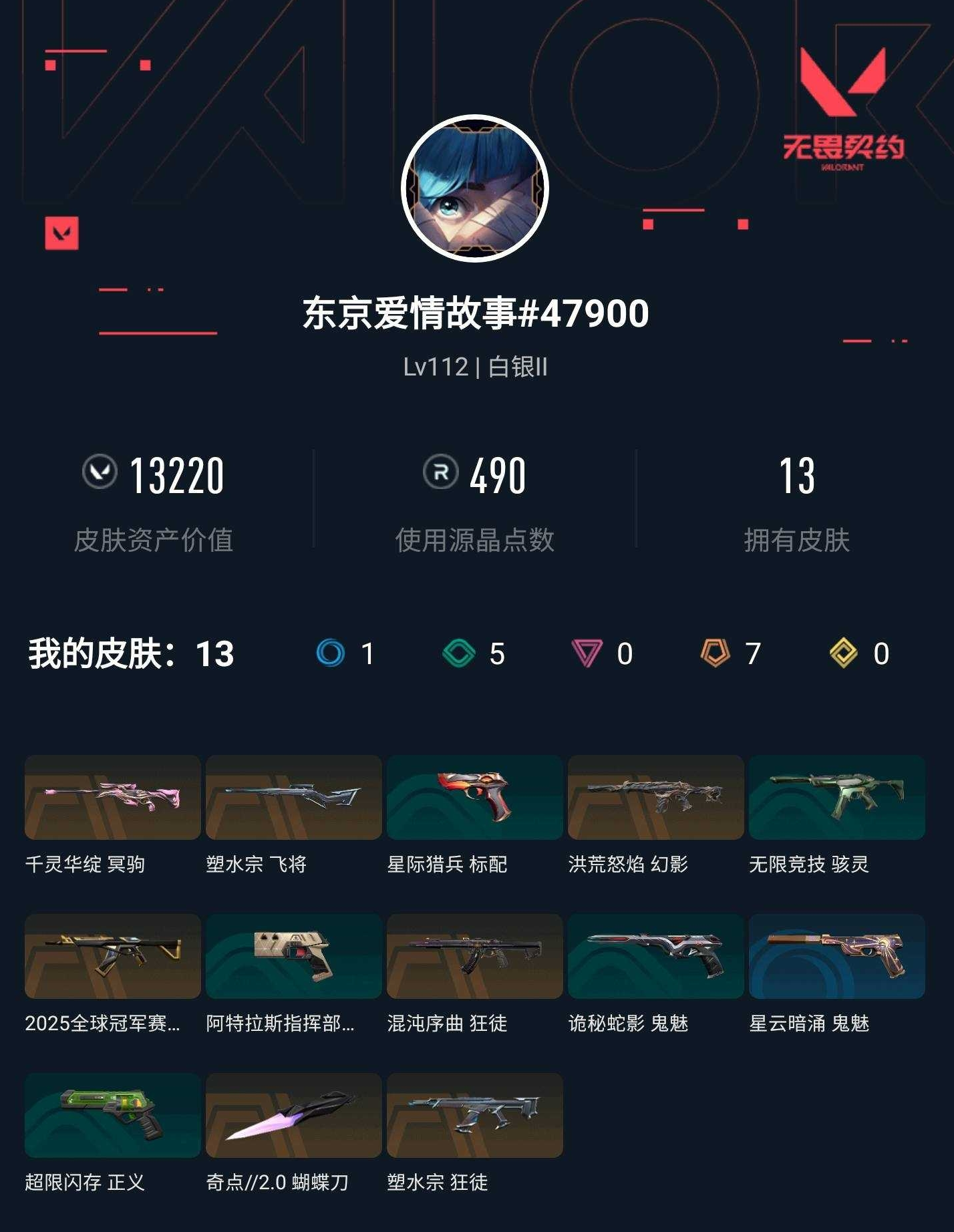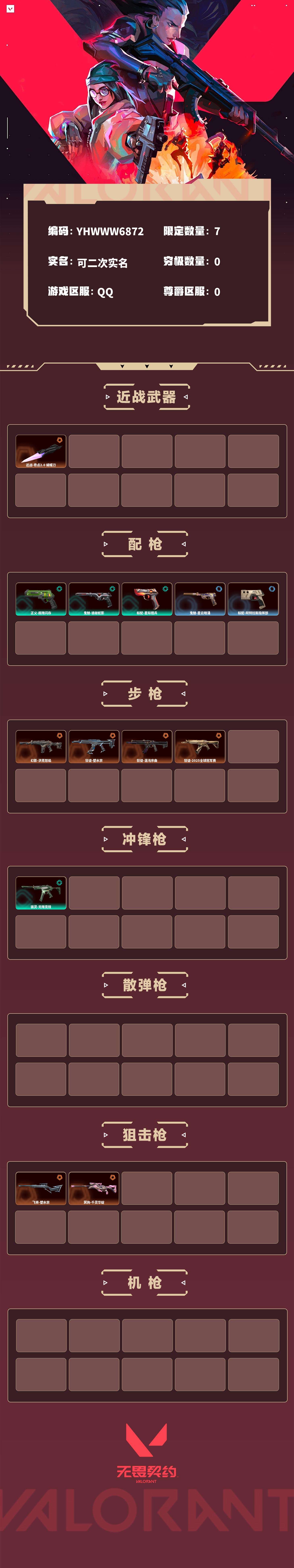 【无畏契约】【yhwww6872】等级:112,已用无畏点13220,已用源晶点490,橙皮:飞将-塑水宗|幻影-洪荒怒焰|狂徒-塑水宗|狂徒-混沌序曲|冥驹-千灵华绽|近战-奇点2.0 蝴蝶刀|狂徒-2025全球冠军赛__段位:白银__绿皮:骇灵-无限竞技|正义-超限闪存|鬼魅-诡秘蛇影|标配-星际猎兵__蓝皮:鬼魅-星云暗涌|标配-阿特拉斯指挥部__英雄:尚勃勒|维斯|黑梦|斯凯|暮蝶|盖可|霓虹|壹决|星礈|k/o|幽影|夜露|钢锁|奇乐|炼狱|铁臂|贤者|猎枭|钛狐|芮娜|零|捷风|蝰蛇|不死鸟|幻棱|雷兹|禁灭