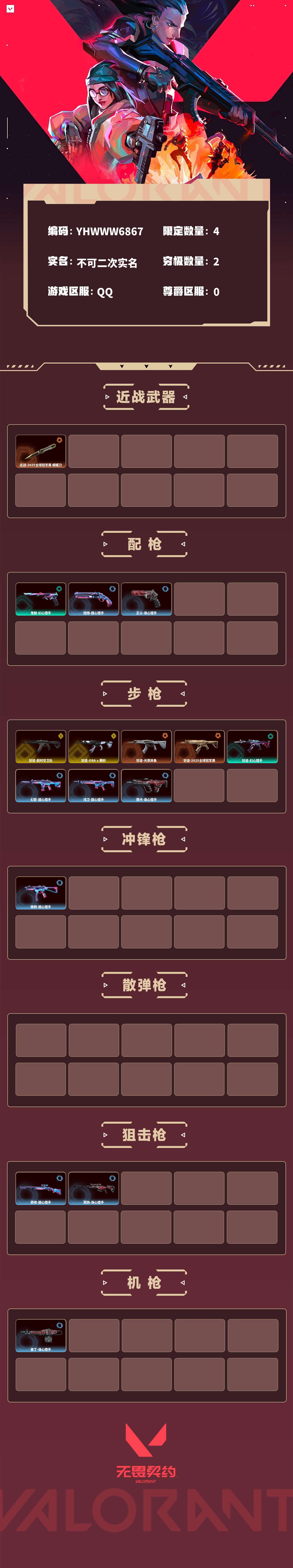【无畏契约】【yhwww6867】等级:35,已用无畏点10840,已用源晶点210,段位:白银__橙皮:狂徒-光荣异象|狂徒-2025全球冠军赛|近战-2025全球冠军赛 蝴蝶刀__金皮:狂徒-超时空卫队|狂徒-a x 颗秒__英雄:霓虹|壹决|夜露|炼狱|贤者|猎枭|钛狐|芮娜|捷风|不死鸟|幻棱|雷兹|禁灭__蓝皮:蜂刺-甜心猎手|短炮-甜心猎手|莽侠-甜心猎手|幻影-甜心猎手|戍卫-甜心猎手|正义-诛心猎手|冥驹-诛心猎手|獠犬-诛心猎手|奥丁-诛心猎手__绿皮:狂徒-幻心猎手|鬼魅-幻心猎手