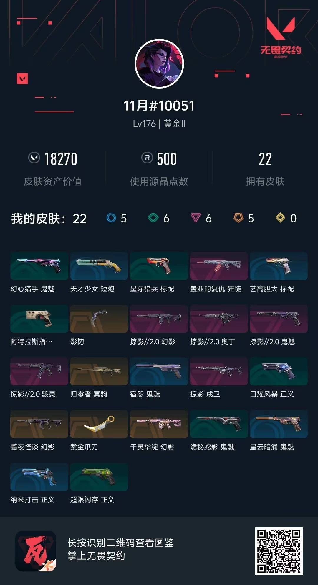 5橙皮 6紫皮 22皮肤 28英雄 62卡面 500已用源晶 黄金段位 【套装】:掠影2.0套装 【近战武器皮肤】:影钩紫金爪刀 【佩呛皮肤】:鬼魅-掠影2.0 【冲锋呛皮肤】:骇灵-掠影2.0 【步呛皮肤】:幻影-黯夜怪谈戍卫-掠影幻影-掠影2.0狂徒-盖亚的复仇幻影-千灵华绽 【狙击