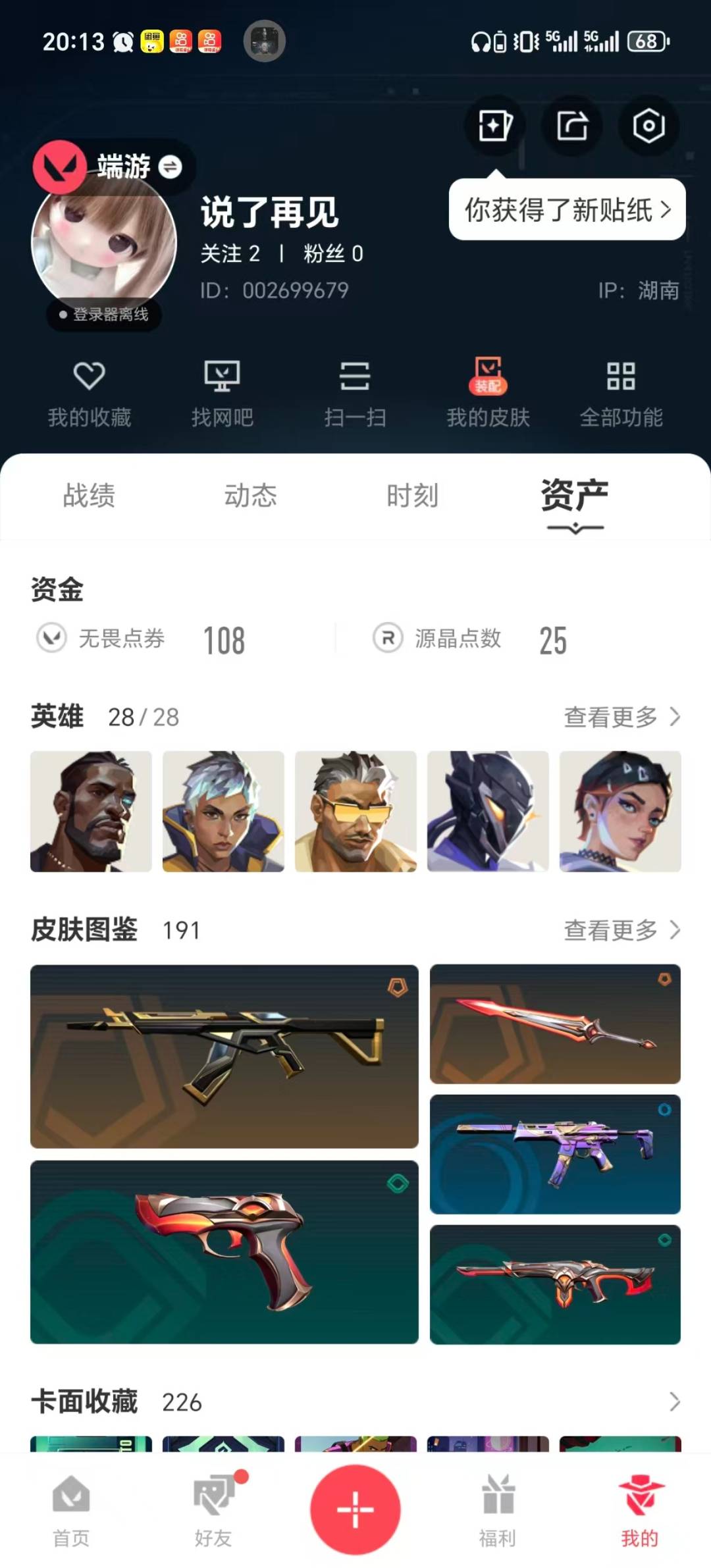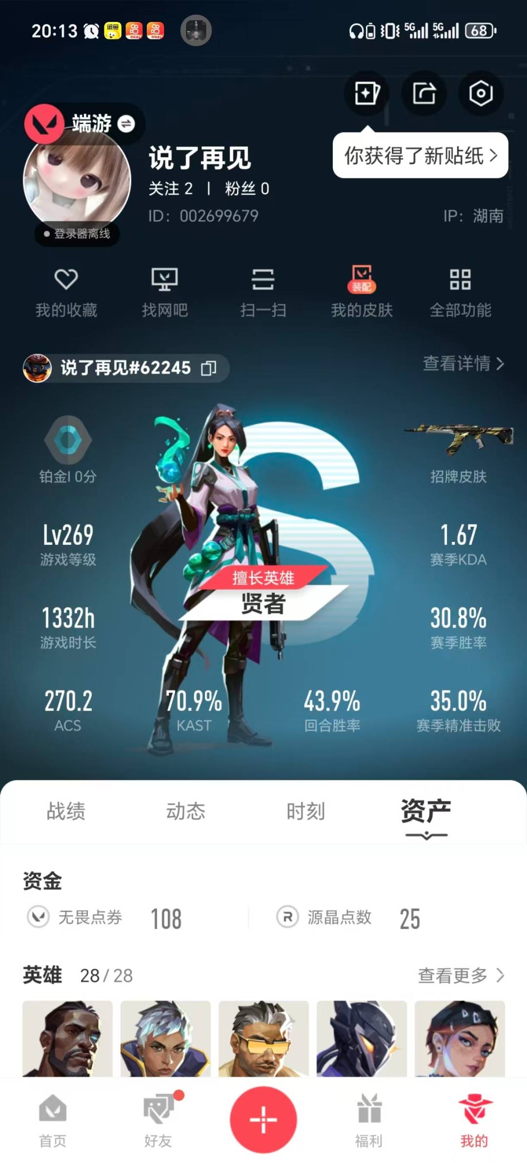 段位: 铂金 亮点皮肤: 狂徒-2021全球冠军赛爪刀-2021全球冠军赛幻影-2022全球冠军赛蝴蝶刀-2022全球冠军赛 套装: 2021全球冠军赛套装盖亚的复仇套装盖世英雄套装掠影套装2022全球冠军赛 近战武器皮肤: 军刀-合金战车盖亚之怒军刀-弧光异彩定海神珍紫金爪刀