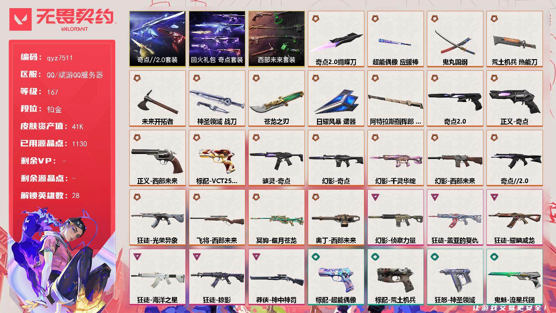 精品铂金小号-低价捡漏出-喜欢的baby来吧-qyz7511-套装:-奇点套装奇点//20套装西部未来-近战武器皮肤:-超能偶像-应援棒蝴蝶刀-奇点//20荒土机兵热能刀鬼丸国纲神圣领域-战刀未来开拓者苍龙之刃-步呛皮肤:-幻影-奇点狂徒-盖亚的复仇幻影-侦察力量狂徒-耀鳞威龙幻影-千灵华绽狂徒-海洋之星狂徒-奇点//20狂徒-掠影幻影-西部未来狂徒-光荣异象-佩呛皮肤:-正义-奇点鬼魅-奇点//20标配-vct25xedg正义-西部未来-狙击呛皮肤:-冥驹-偃月苍龙飞将-西部未来莽侠-神中神罚-冲锋呛皮肤:-骇灵-奇点-机呛皮肤:-奥丁-西部未来-亮点:-【qyz7511】【套装】:西部未来套装,奇点//20套装,回火礼包:奇点套装【英雄】:幻棱,炼狱,维斯,暮蝶,钛狐,壹决,铁臂,捷风,雷兹,幽影,不死鸟,贤者,猎枭,蝰蛇,零,芮娜,奇乐,尚勃勒,霓虹,斯凯,夜露,星礈,k/o,海神,盖可,黑梦,钢锁【近战-武器】:近战武器-5周年//公测重制版-苍龙之刃,近战武器-奇点//20-蝴蝶刀,近战武器-鬼丸国纲,近战武器-未来开拓者,近战武器-超能偶像-应援棒,近战武器-荒土机兵-热能刀,近战武器-神圣领域-战刀,近战武器-日耀风暴-遗器,近战武器-阿特拉斯指挥部-甩棍【狂徒】:狂徒-奇点//20,狂徒-光荣异象,狂徒-掠影,狂徒-盖亚的复仇,狂徒-海洋之星,狂徒-耀鳞威龙,狂徒-超能偶像,狂徒-荒土机兵【幻影】:幻影-奇点,幻影-千灵华绽,幻影-西部未来,幻影-侦察力量,幻影-神圣领域,幻影-聚合之力,幻影-纳米打击,幻影-西部未来【戍卫】:戍卫-超能偶像,戍卫-逆冲蛮牛,戍卫-月球哨兵【獠犬】:獠犬-神圣领域,獠犬-采蜜小蜂队,獠犬-逆冲蛮牛【冥驹】:冥驹-偃月苍龙,冥驹-荒土机兵,冥驹-星云暗涌【飞将】:飞将-西部未来,飞将-聚合之力【莽侠】:莽侠-神中神罚,莽侠-月球哨兵【战神】:战神-神圣领域,战神-采蜜小蜂队【奥丁】:奥丁-西部未来,奥丁-纳米打击【判官】:判官-超能偶像,判官-采蜜小蜂队,判官-纳米打击x【雄鹿】:雄鹿-逆冲蛮牛,雄鹿-月球哨兵【骇灵】:骇灵-奇点,骇灵-荒土机兵,骇灵-星云暗涌【蜂刺】:蜂刺-聚合之力,蜂刺-星云暗涌【标配】:标配-超能偶像,标配-荒土机兵【