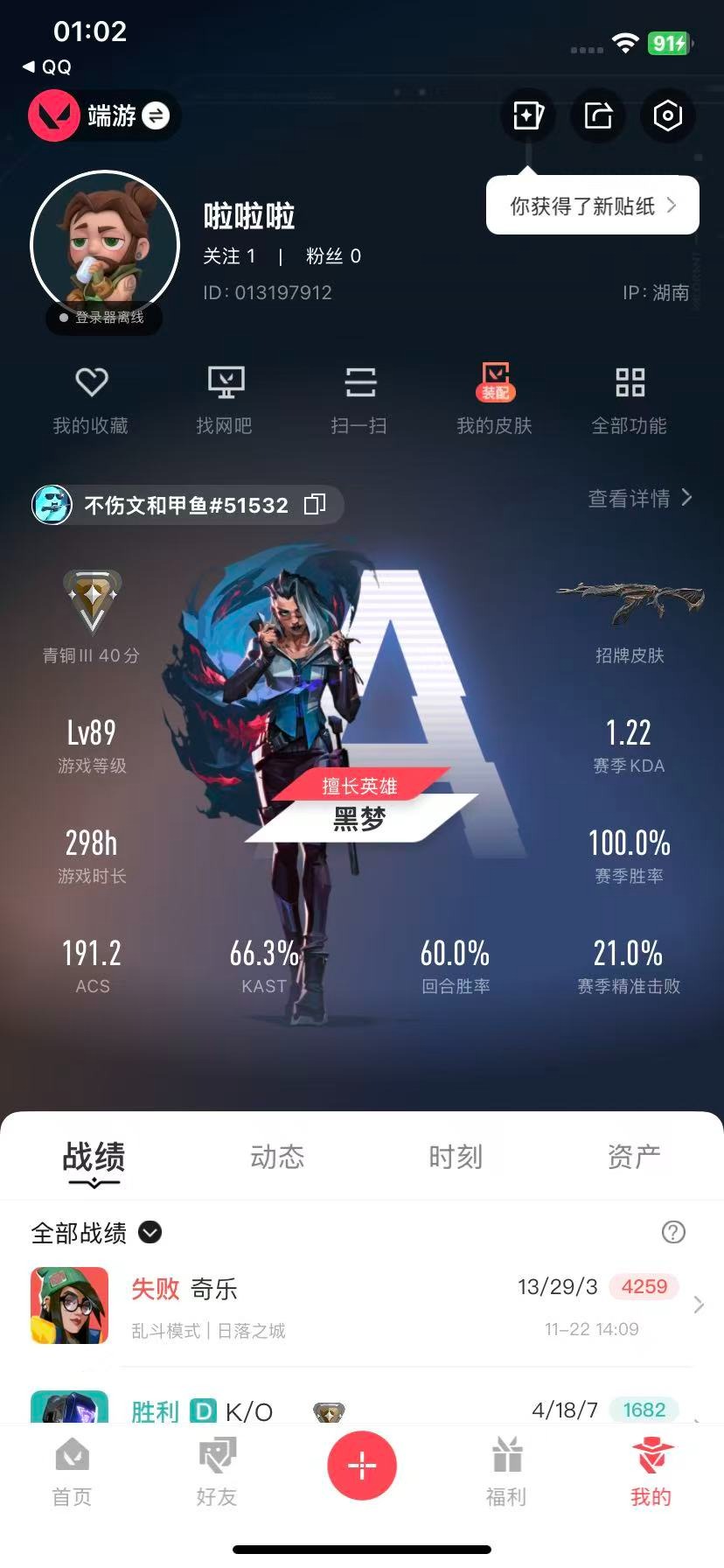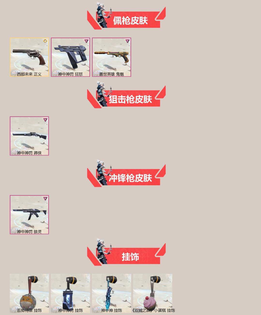 13橙皮 9紫皮 78皮肤 15英雄 102卡面 980已用源晶 青铜段位 【套装】:神罚套装神中神罚套装 【近战武器皮肤】:神之刃神圣领域 战刀镭切荒土机兵热能刀诡秘蛇影 【佩呛皮肤】:狂怒-神中神罚正义-西部未来鬼魅-盖世英雄 【冲锋呛皮肤】:骇灵-神中神罚 【步呛皮肤】:狂徒-